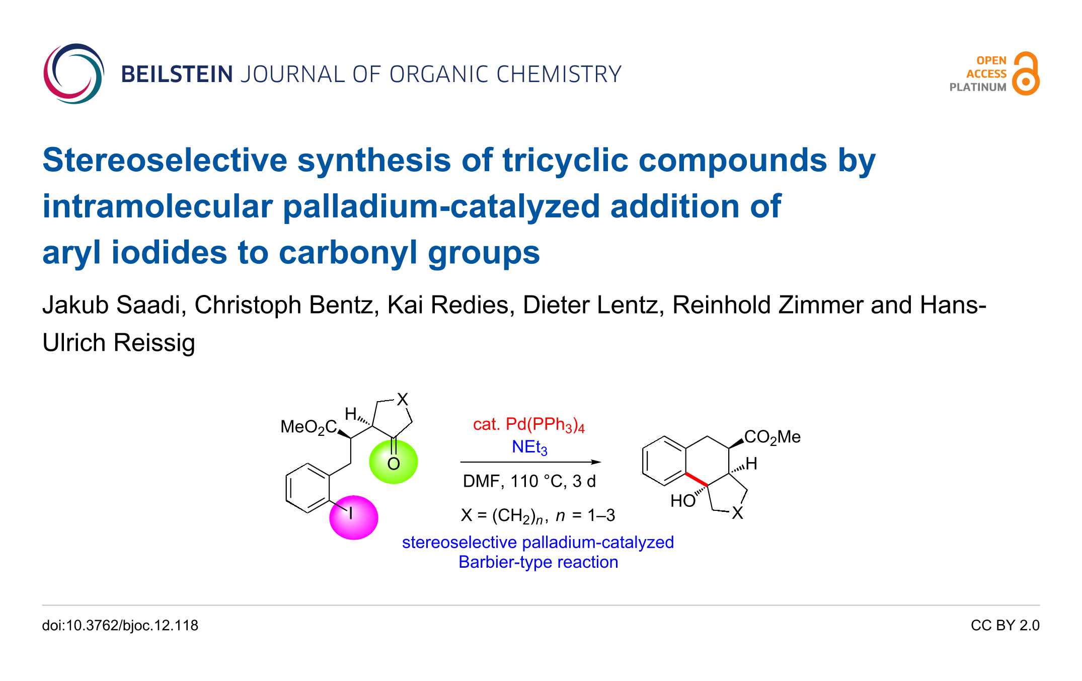 - Saadi, J.; Bentz, C.; Redies, K.; Lentz, D.; Zimmer, R.; Reissig, H.-U. Stereoselective Synthesis of Tricyclic Compounds by Intramolecular Palladium-Catalyzed Addition of Aryl Iodides to Carbonyl Groups. ChemInform 2016, 47. doi:10.1002/chin.201636086