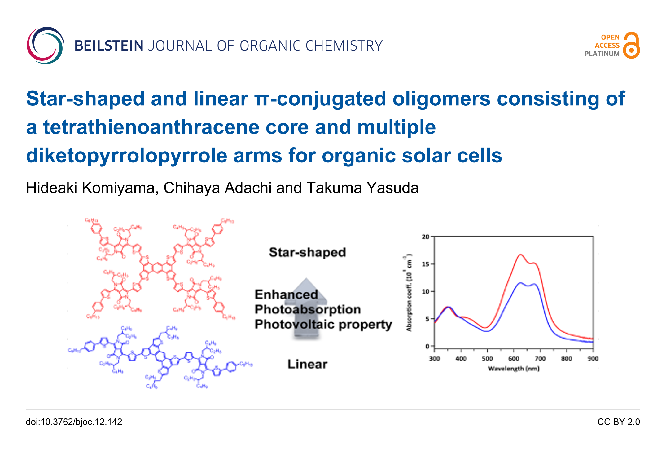 • Komiyama, H.; Adachi, C.; Yasuda, T. Tetrathienoanthracene-based π-Extended Narrow-band-gap Molecules: Synthesis, Physicochemical, and Photovoltaic Properties. Chemistry Letters 2017, 46, 29–31. doi:10.1246/cl.160858