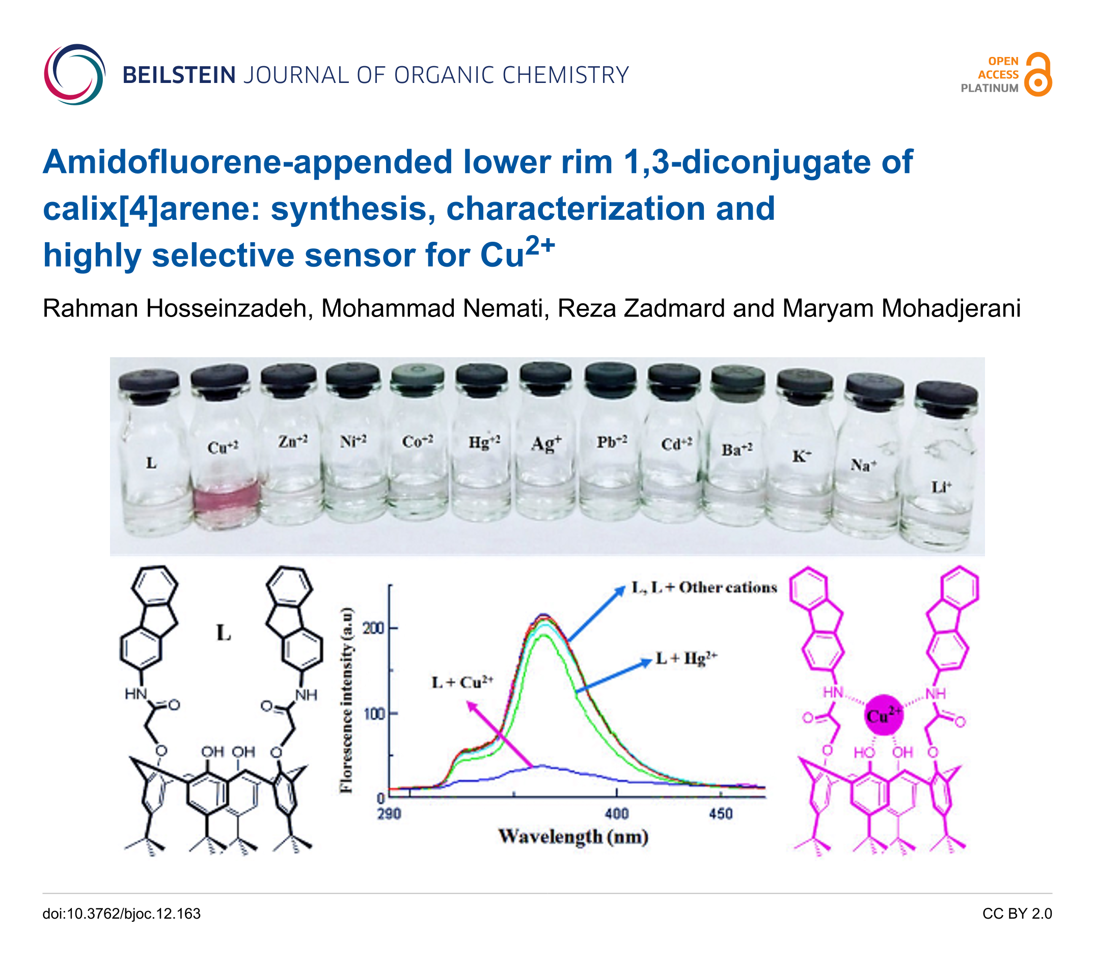 • Hosseinzadeh, R.; Domehri, E.; Tajbakhsh, M.; Bekhradnia, A. New fluorescent sensor based on a calix[4]arene bearing two triazole–coumarin units for copper ions: application for Cu 2+ detection in human blood serum. Journal of Inclusion Phenomena and Macrocyclic Chemistry 2018, 93, 245–252. doi:10.1007/s10847-018-0872-3