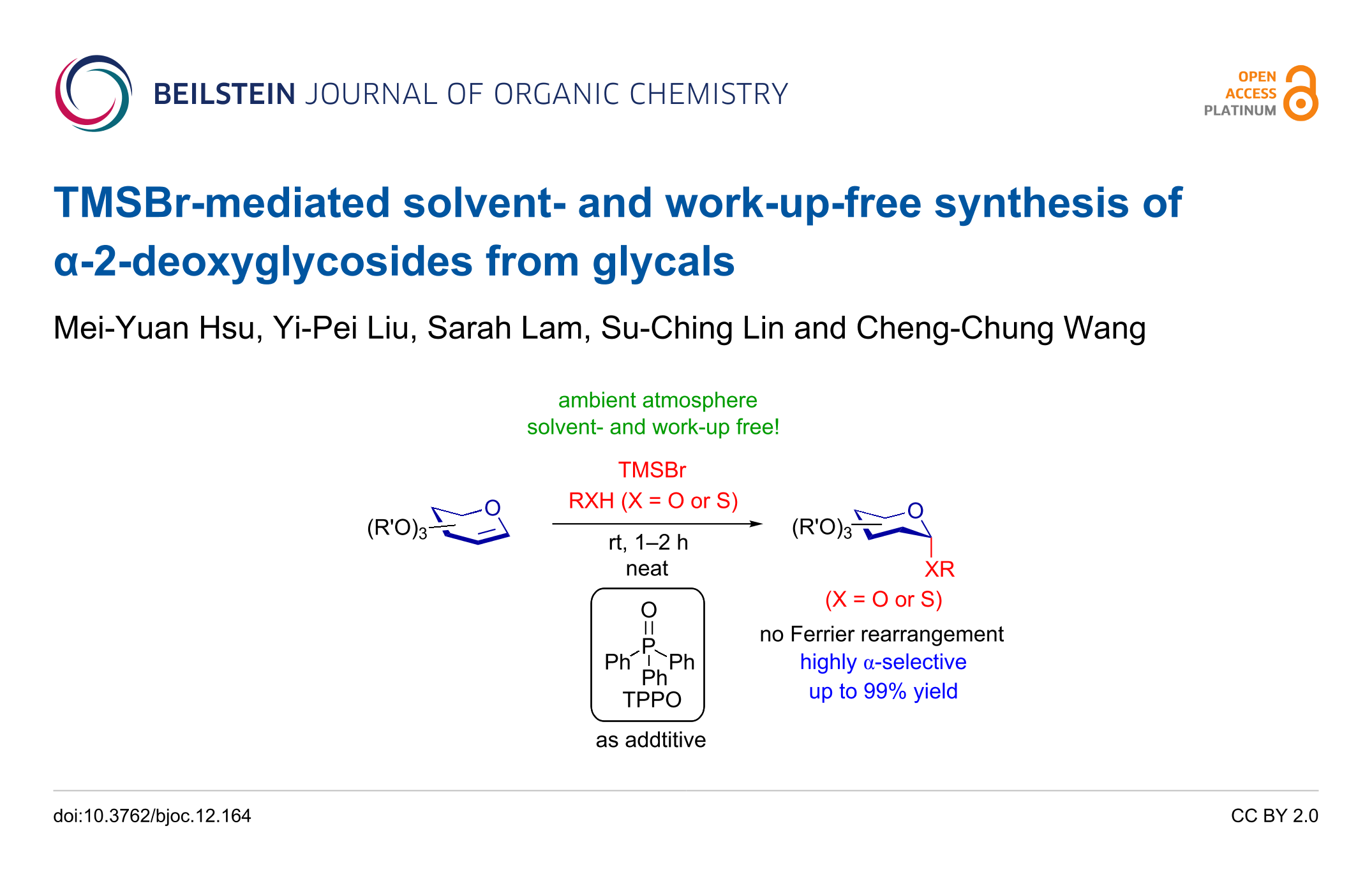 • Chang, C.-W.; Lin, M.-H.; Wu, C.-H.; Chiang, T.-Y.; Wang, C.-C. Mapping Mechanisms in Glycosylation Reactions with Donor Reactivity: Avoiding Generation of Side Products. The Journal of organic chemistry 2020, 85, 15945–15963. doi:10.1021/acs.joc.0c01313