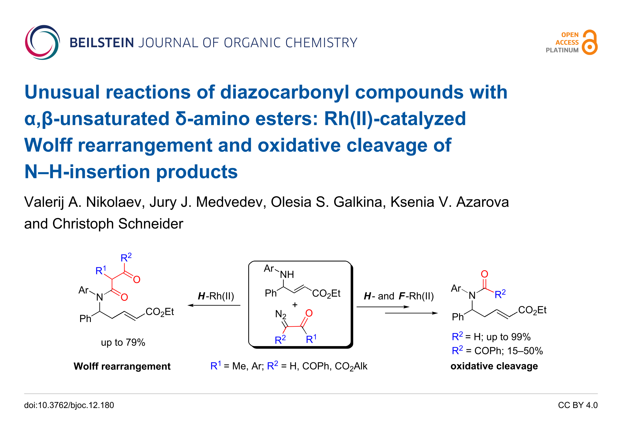 - Nikolaev, V. A.; Medvedev, J. J.; Galkina, O. S.; Azarova, K. V.; Schneider, C. Unusual Reactions of Diazocarbonyl Compounds with α,β-Unsaturated δ-Amino Esters: Rh(II)-Catalyzed Wolff Rearrangement and Oxidative Cleavage of N—H-Insertion Products. ChemInform 2016, 47. doi:10.1002/chin.201649023