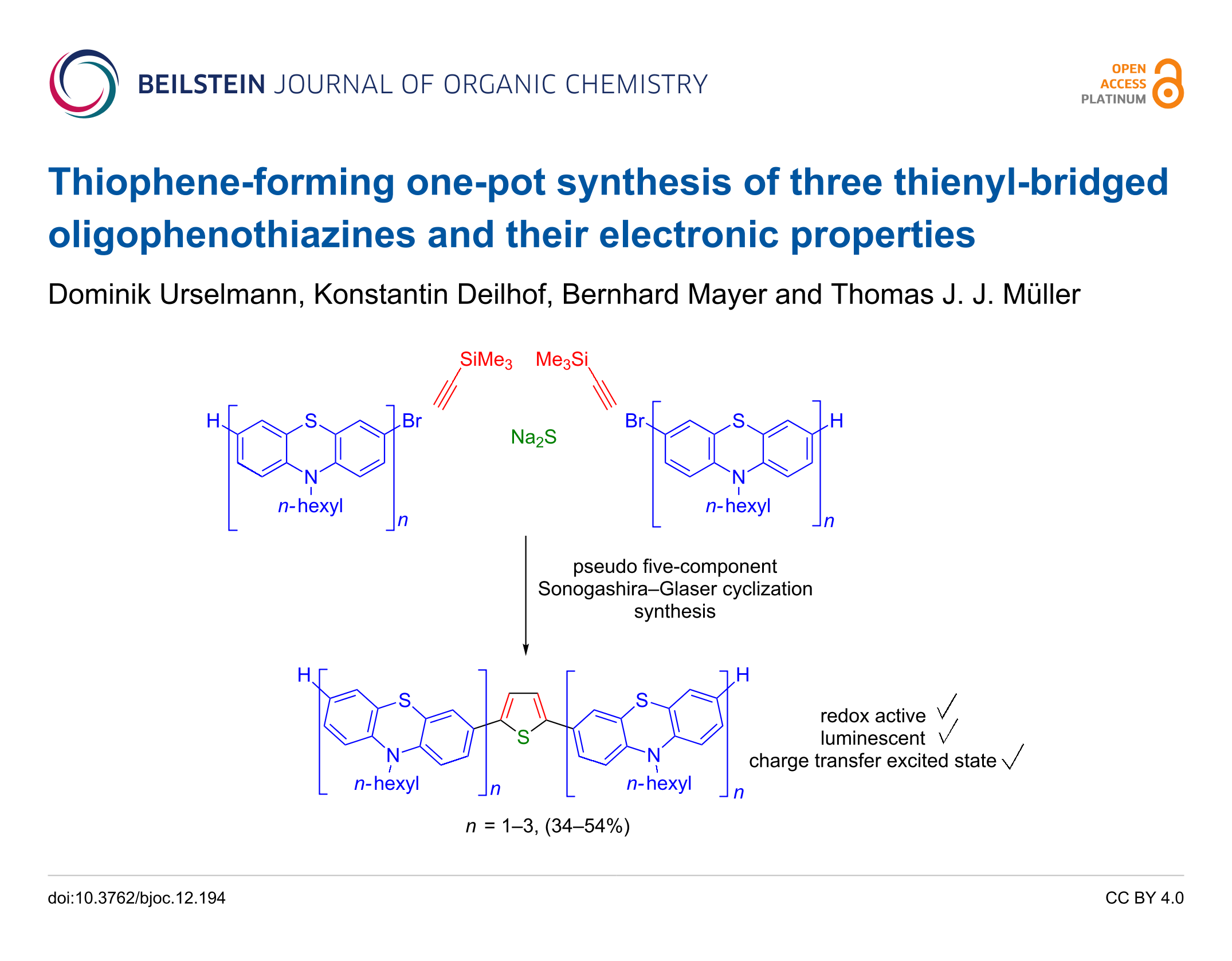 - Nau, J.; Brüning, V.; Biesen, L.; Knedel, T.; Janiak, C.; Müller, T. J. J. Synthesis and Electronic Properties of Conjugated syn,syn‐Dithienothiazine Donor‐Acceptor‐Donor Dumbbells. European Journal of Organic Chemistry 2022, 2022. doi:10.1002/ejoc.202101398