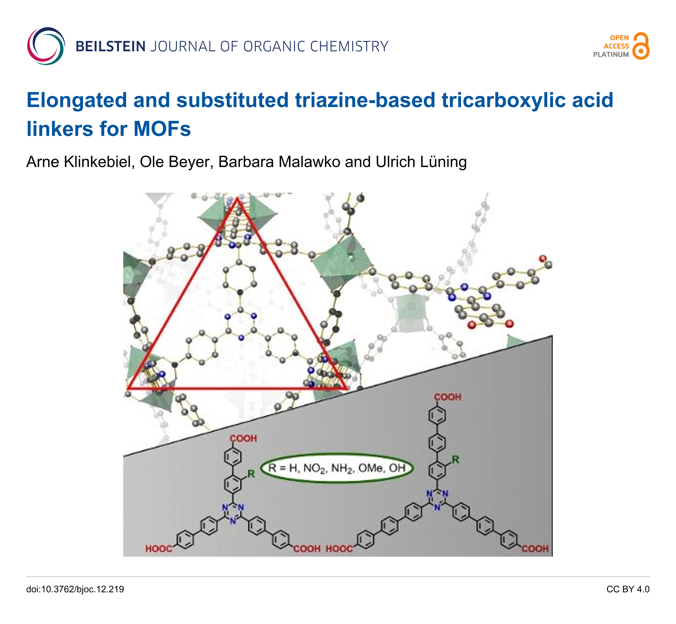 - Klinkebiel, A.; Beyer, O.; Lüning, U. Substituted 1,3,5-Triazine Hexacarboxylates as Potential Linkers for MOFs. Molecules (Basel, Switzerland) 2019, 24, 3480. doi:10.3390/molecules24193480