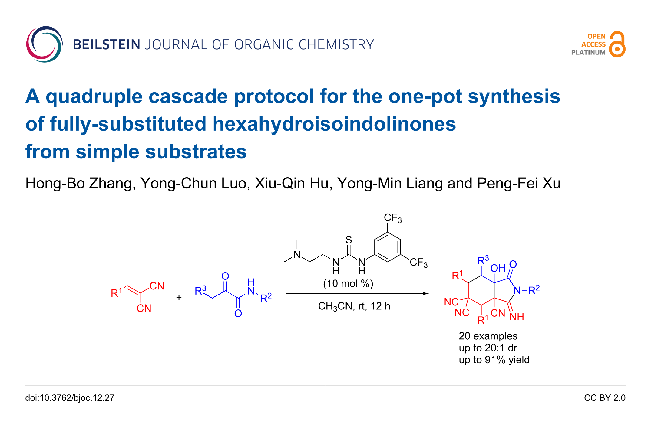 - Zhang, H.-B.; Luo, Y.-C.; Hu, X.-Q.; Liang, Y.-M.; Xu, P.-F. A Quadruple Cascade Protocol for the One-Pot Synthesis of Fully-Substituted Hexahydroisoindolinones from Simple Substrates. ChemInform 2016, 47. doi:10.1002/chin.201622125