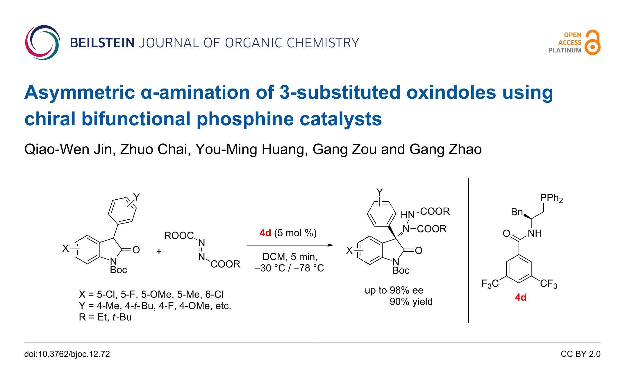 - Jin, Q.-W.; Chai, Z.; Huang, Y.-M.; Zou, G.; Zhao, G. Asymmetric α‐Amination of 3‐Substituted Oxindoles Using Chiral Bifunctional Phosphine Catalysts. ChemInform 2016, 47. doi:10.1002/chin.201626136