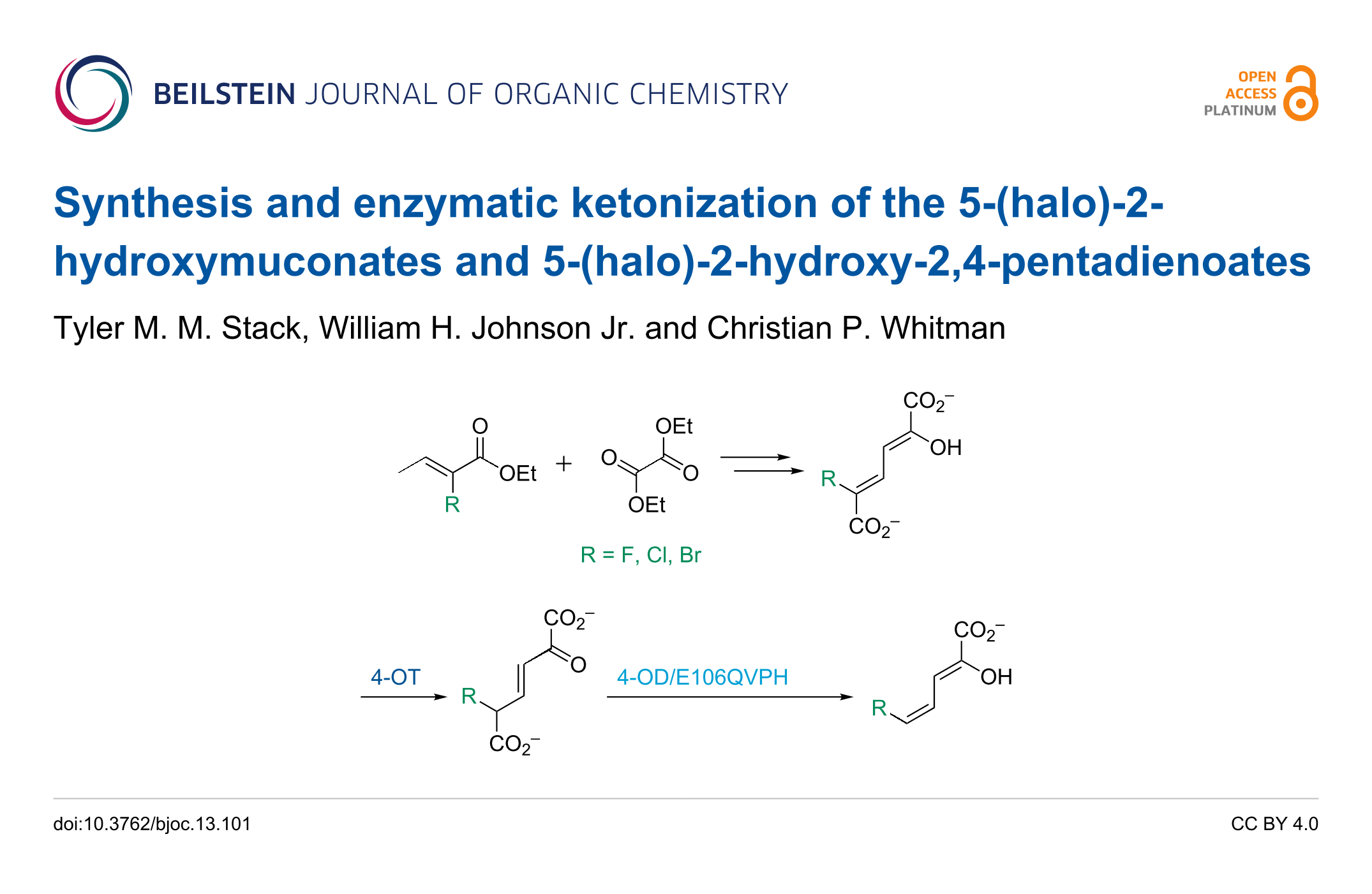 - Stack, T. M. M.; Li, W.; Johnson, W. H.; Zhang, Y. J.; Whitman, C. P. Inactivation of 4-Oxalocrotonate Tautomerase by 5-Halo-2-hydroxy-2,4-pentadienoates. Biochemistry 2018, 57, 1012–1021. doi:10.1021/acs.biochem.7b00899