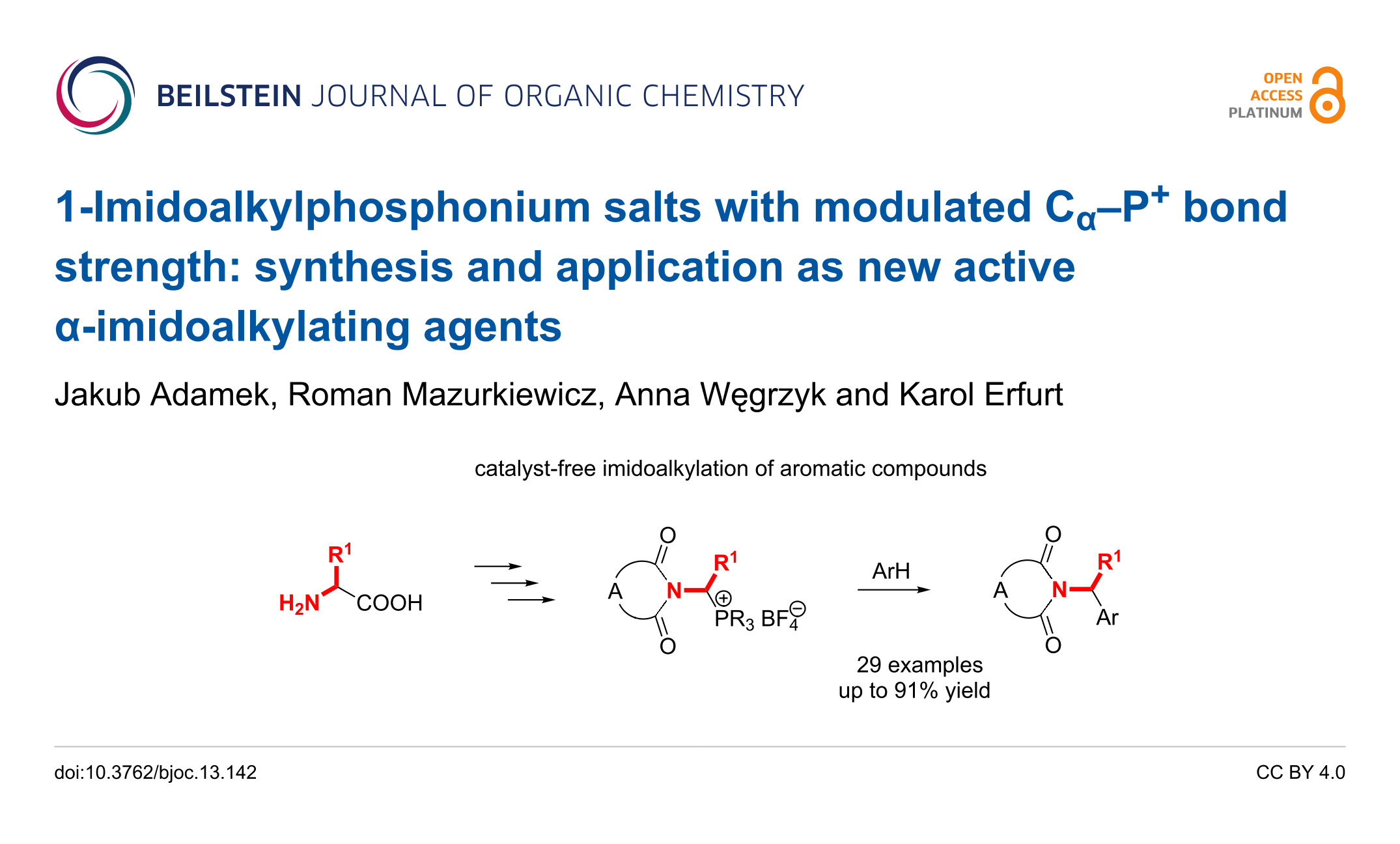 - Adamek, J.; Węgrzyk, A. Catalyst-free Friedel-Crafts reaction of 1-(N-acylamino)- and 1-imidoalkyltriarylphosphonium salts with arenes. Phosphorus, Sulfur, and Silicon and the Related Elements 2018, 194, 351–352. doi:10.1080/10426507.2018.1542398