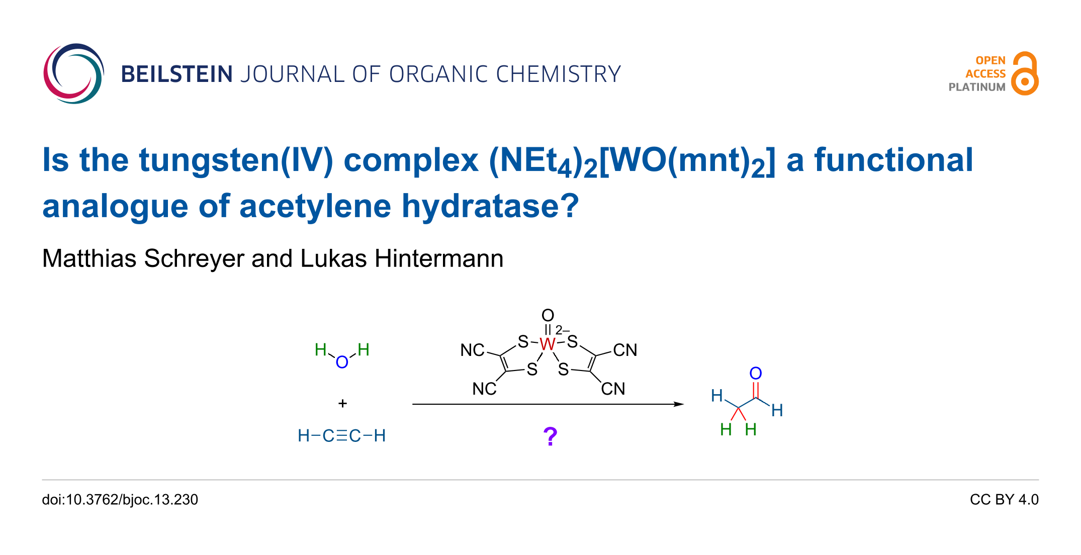 - Vidovič, C.; Peschel, L. M.; Buchsteiner, M.; Belaj, F.; Mösch-Zanetti, N. C. Structural Mimics of Acetylene Hydratase: Tungsten Complexes Capable of Intramolecular Nucleophilic Attack on Acetylene. Chemistry (Weinheim an der Bergstrasse, Germany) 2019, 25, 14267–14272. doi:10.1002/chem.201903264