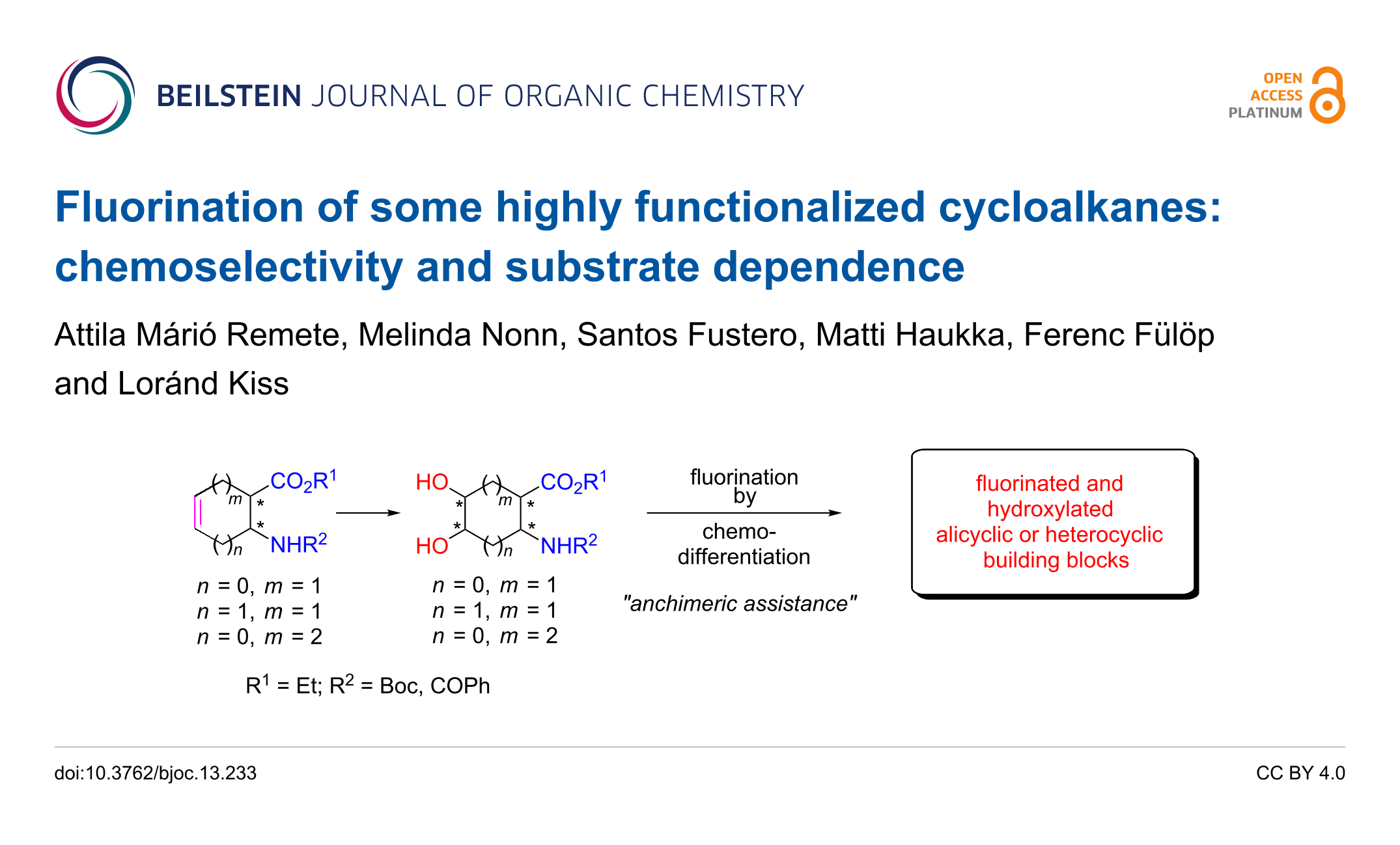 - Remete, A. M.; Novák, T. T.; Nonn, M.; Haukka, M.; Fülöp, F.; Kiss, L. Synthesis of novel fluorinated building blocks via halofluorination and related reactions. Beilstein journal of organic chemistry 2020, 16, 2562–2575. doi:10.3762/bjoc.16.208