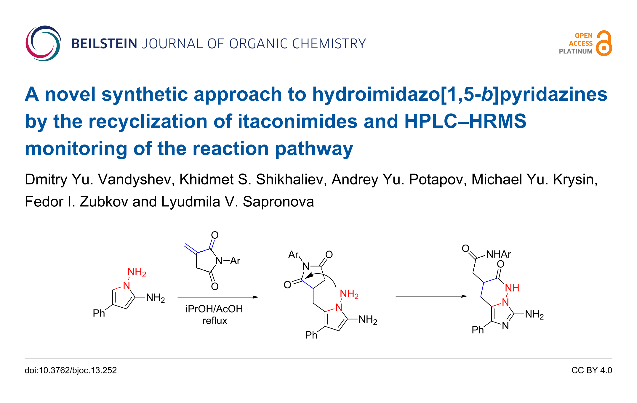 - Yu. Vandyshev, D.; Shikhaliev, K. S.; Yu. Krysin, M.; Ilyinova, T. N.; Mangusheva, D. A.; Sidorenko, O. E.; Iminova, R. R. New regio/chemoselective synthesis of hydrogenated imidazo[1,5-b]pyridazines. Mendeleev Communications 2022, 32, 637–639. doi:10.1016/j.mencom.2022.09.023