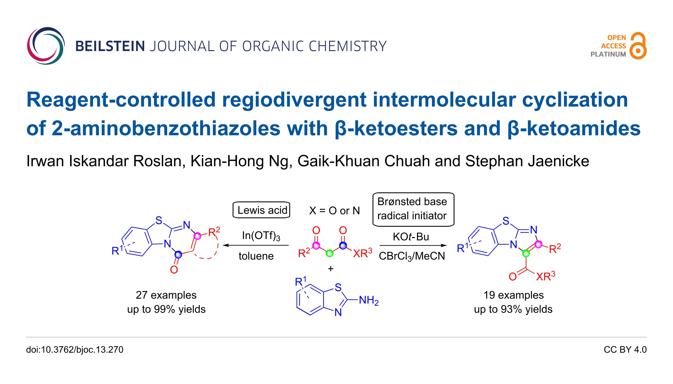 - Roslan, I. I.; Ng, K.-H.; Chuah, G.-K.; Jaenicke, S. Reagent-controlled regiodivergent intermolecular cyclization of 2-aminobenzothiazoles with β-ketoesters and β-ketoamides. Beilstein journal of organic chemistry 2017, 13, 2739–2750. doi:10.3762/bjoc.13.270