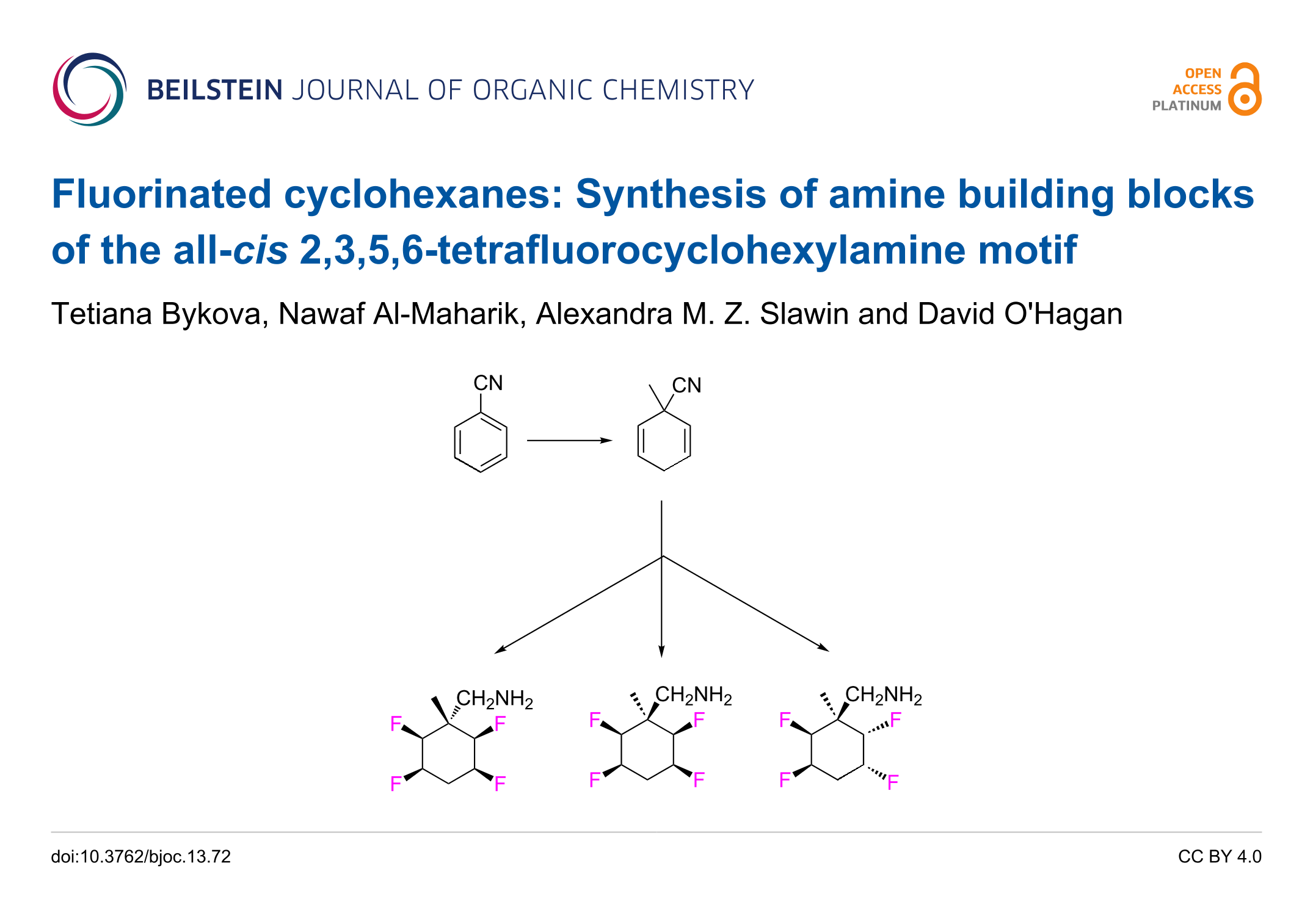 - Bykova, T.; Al-Maharik, N.; Slawin, A. M. Z.; Bühl, M.; Lebl, T.; O'Hagan, D. Benzylic Functionalisation of Phenyl all-cis-2,3,5,6-Tetrafluorocyclohexane Provides Access to New Organofluorine Building Blocks. Chemistry (Weinheim an der Bergstrasse, Germany) 2018, 24, 13290–13296. doi:10.1002/chem.201802166