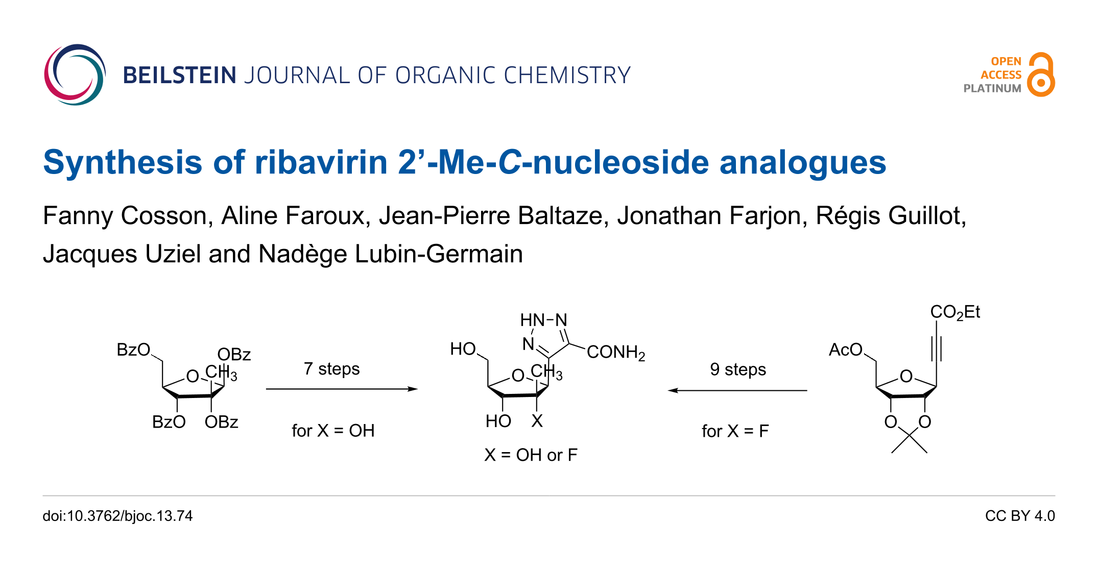 - Bozinovic, N.; Aguiar, V. M. d.; Ferry, A.; Gallier, F.; Lubin-Germain, N.; Uziel, J.; Miranda, L. S. d. M. E. Studies on the synthesis of 1'-CN-triazolyl-C-ribosides. Organic & biomolecular chemistry 2022, 20, 7261–7269. doi:10.1039/d2ob01403c