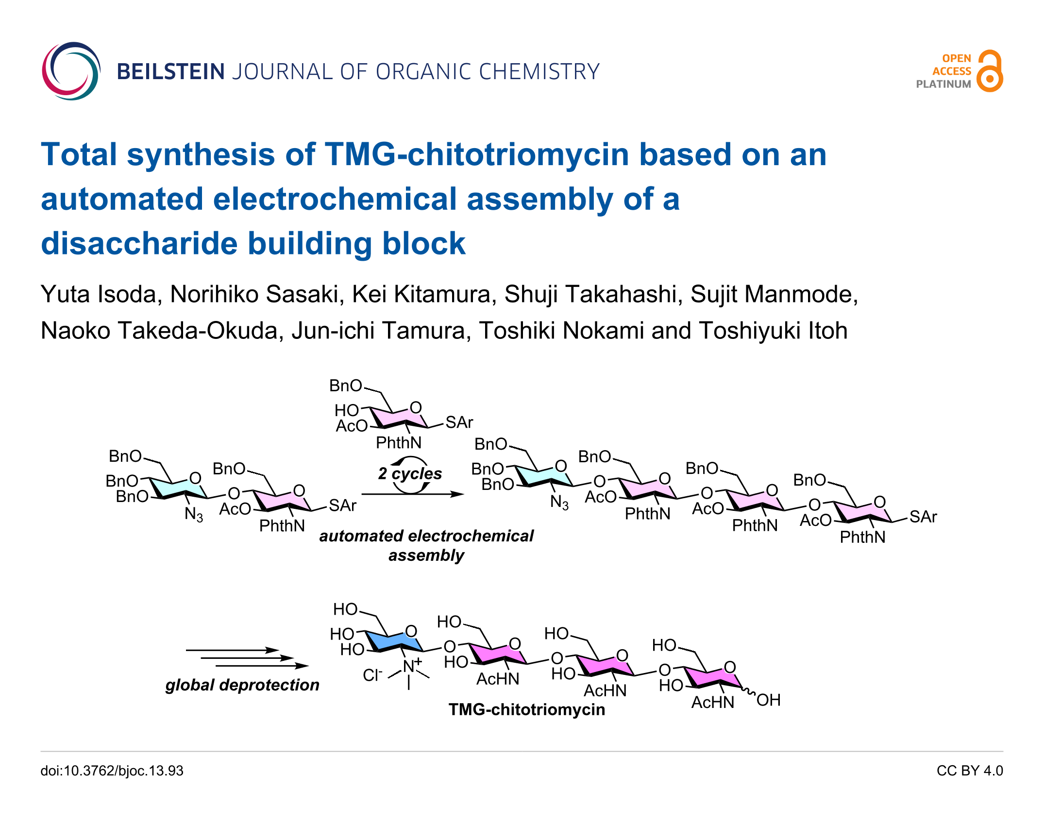 - RAHMAN, M. A.; TAKAHASHI, S.; SASAKI, N.; ITOH, T.; OHNUMA, T.; NOKAMI, T. Synthesis of Oligoglucosamine Analogues Containing the N,N,N-Trimethyl-d-glucosaminyl Unit by Automated Electrochemical Assembly. Electrochemistry 2023, 91, 112013. doi:10.5796/electrochemistry.23-67089