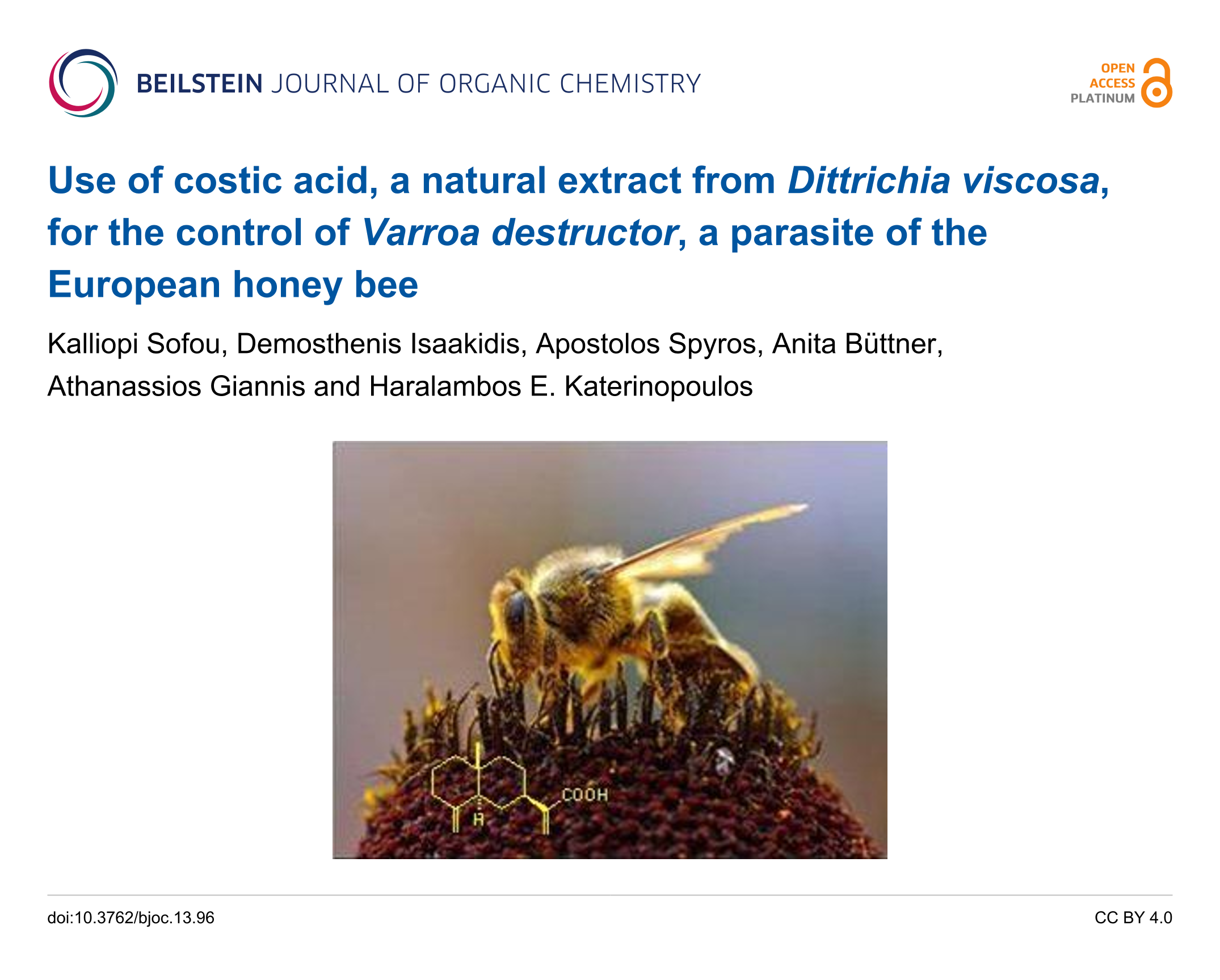- Georgiladaki, S.; Isaakidis, D.; Spyros, A.; Tsikalas, G. K.; Katerinopoulos, H. E. Enantioselective synthesis of a costic acid analogue with acaricidal activity against the bee parasite Varroa destructor. Royal Society open science 2020, 7, 200612. doi:10.1098/rsos.200612