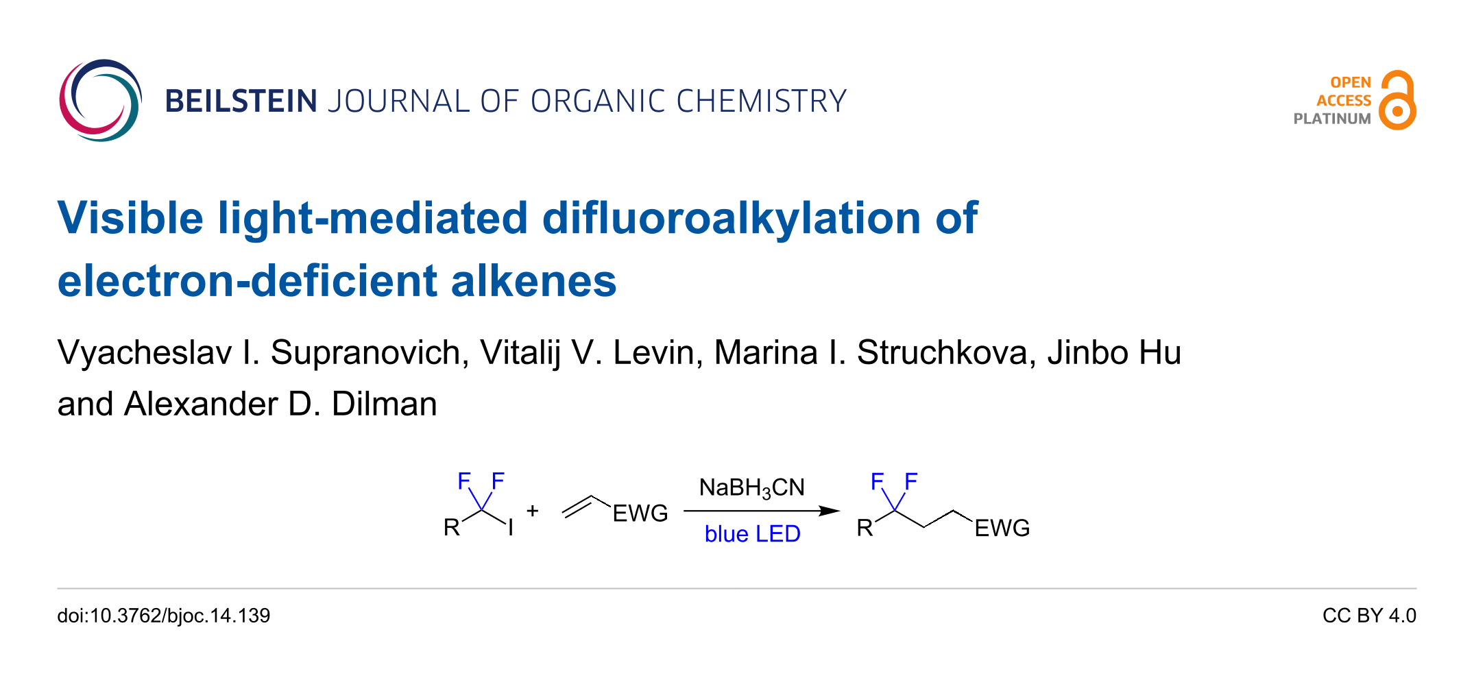 - Zubkov, M. O.; Kosobokov, M. D.; Levin, V. V.; Kokorekin, V. A.; Korlyukov, A. A.; Hu, J.; Dilman, A. D. A novel photoredox-active group for the generation of fluorinated radicals from difluorostyrenes. Chemical science 2019, 11, 737–741. doi:10.1039/c9sc04643g