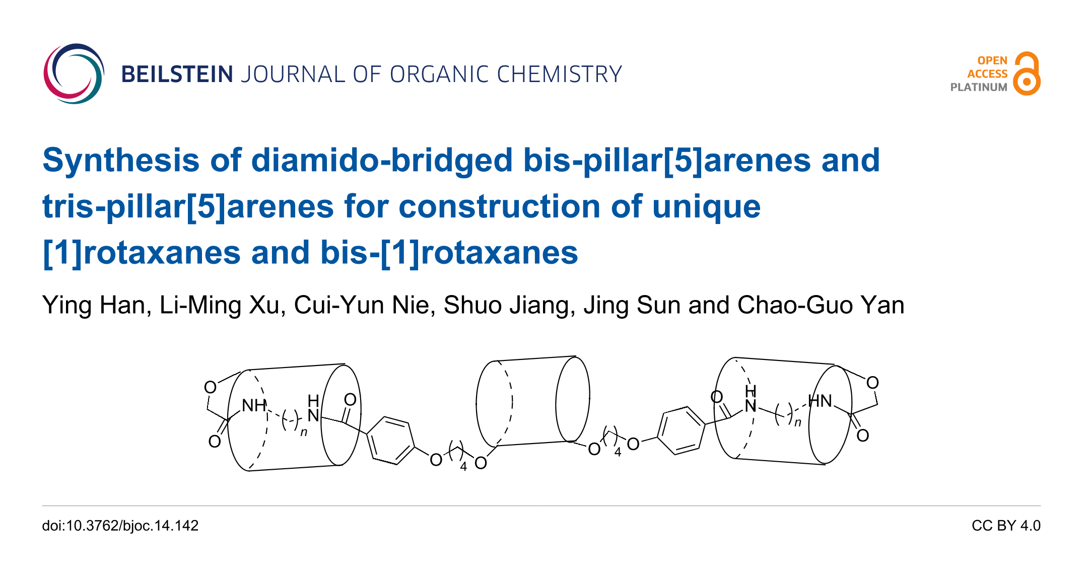 - Li, D.; Han, Y.; Sun, J.; Liu, W.-L.; Yan, C.-G. Convenient construction of unique bis-[1]rotaxanes based on azobenzene-bridged dipillar[5]arenes. Journal of Inclusion Phenomena and Macrocyclic Chemistry 2021, 102, 261–270. doi:10.1007/s10847-021-01115-0