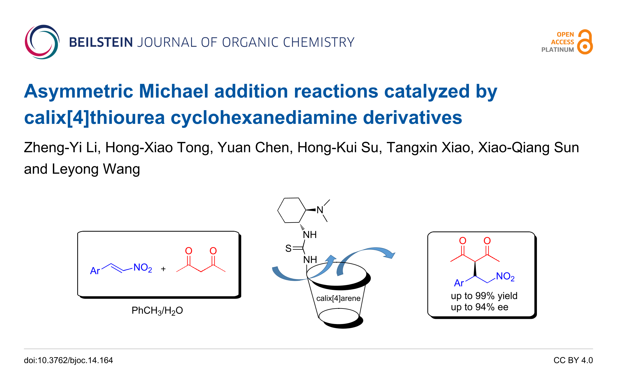 - Yang, K.; Ma, Z.; Tong, H.-X.; Sun, X.; Hu, X.-Y.; Li, Z. Asymmetric Michael addition reactions catalyzed by a novel upper-rim functionalized calix[4]squaramide organocatalyst. Chinese Chemical Letters 2020, 31, 3259–3262. doi:10.1016/j.cclet.2020.02.057