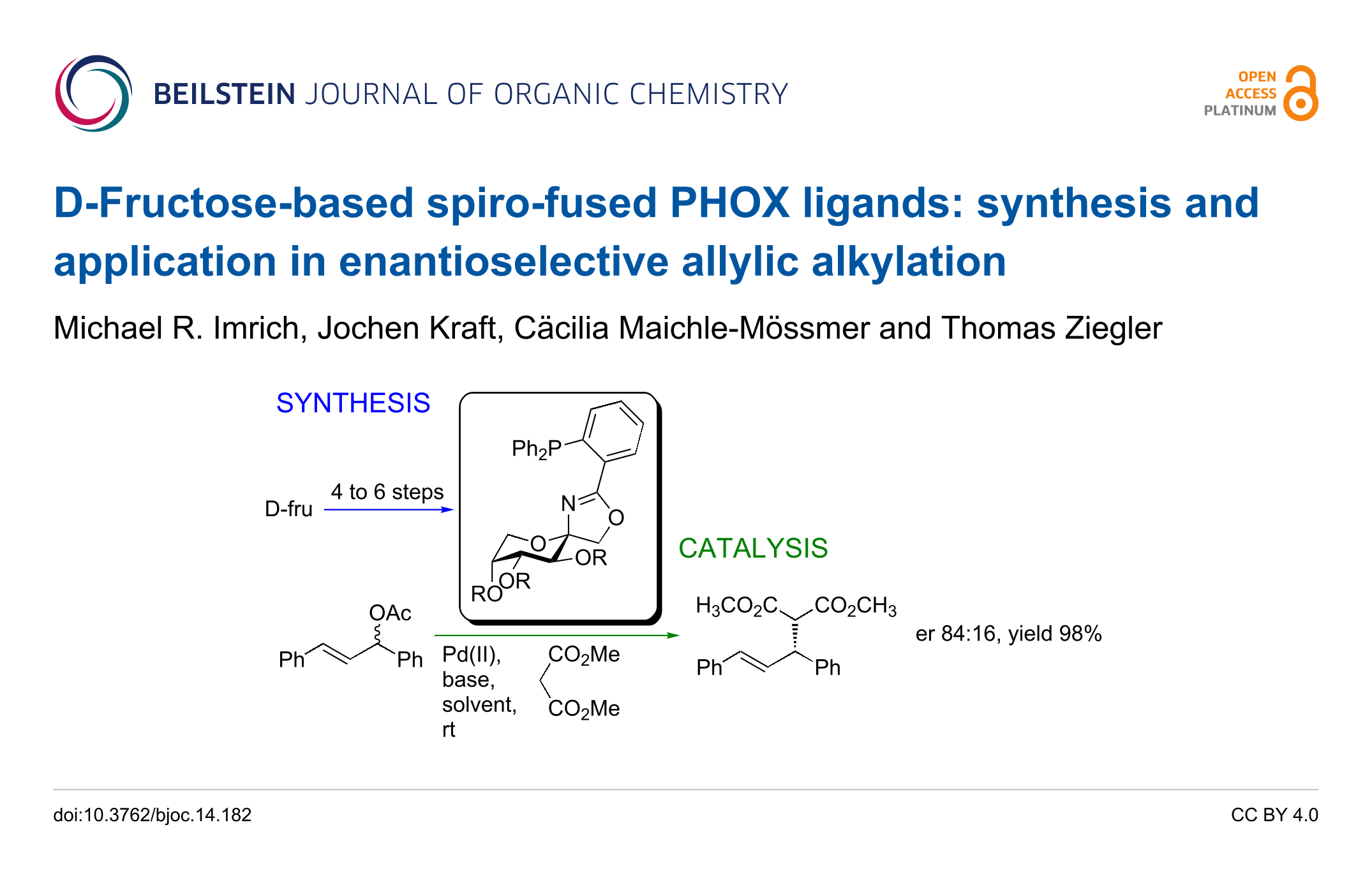 - Imrich, M. R.; Maichle-Mössmer, C.; Ziegler, T. d-Fructose Based Spiro-Fused PHOX Ligands: Palladium Complexes and Application in Catalysis. European Journal of Organic Chemistry 2019, 2019, 3955–3963. doi:10.1002/ejoc.201900490