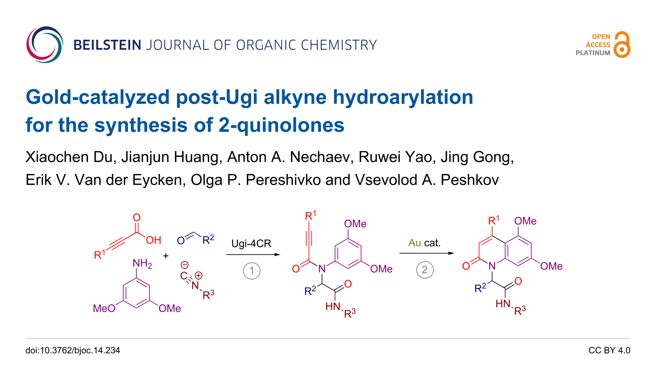 - Du, X.; Yu, J.; Gong, J.; Zaman, M.; Pereshivko, O. P.; Peshkov, V. A. Gold-Catalyzed Post-Ugi Cascade Transformation for the Synthesis of 2-Pyridones. European Journal of Organic Chemistry 2019, 2019, 2502–2507. doi:10.1002/ejoc.201900027