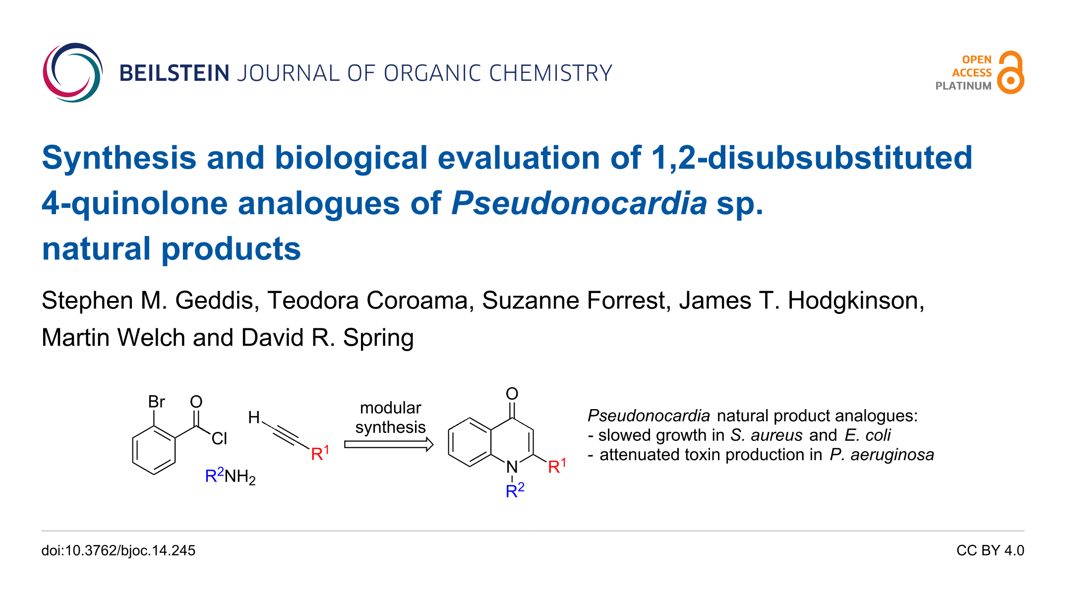 Geddis, S. M.; Coroama, T.; Forrest, S.; Hodgkinson, J. T.; Welch, M.; Spring, D. R. Beilstein J. Org. Chem. 2018, 14, 2680–2688. doi:10.3762/bjoc.14.245