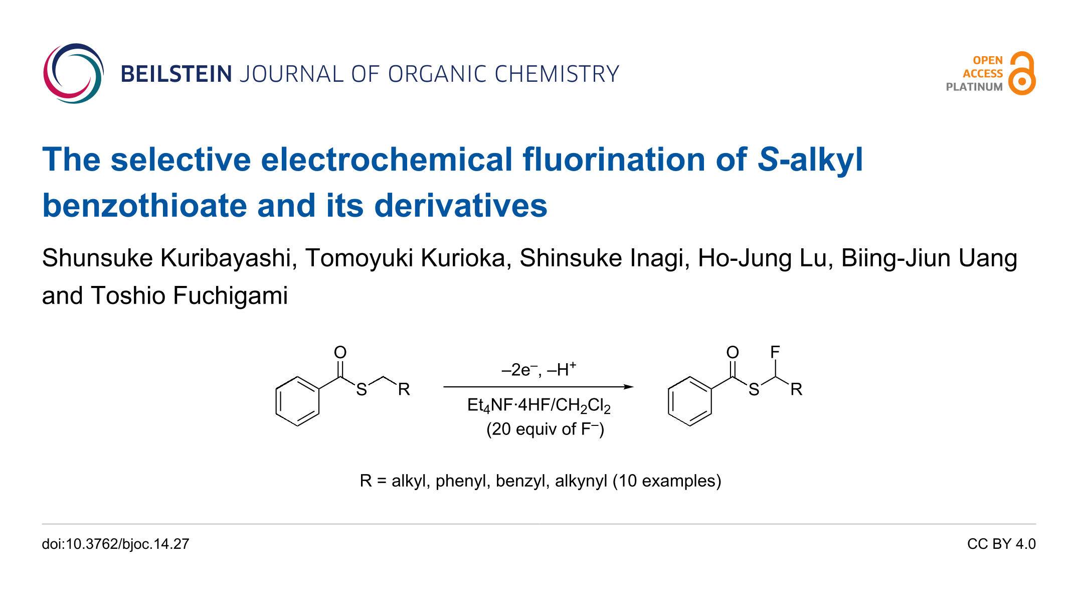 Kuribayashi, S.; Kurioka, T.; Inagi, S.; Lu, H.-J.; Uang, B.-J.; Fuchigami, T. Beilstein J. Org. Chem. 2018, 14, 389–396. doi:10.3762/bjoc.14.27