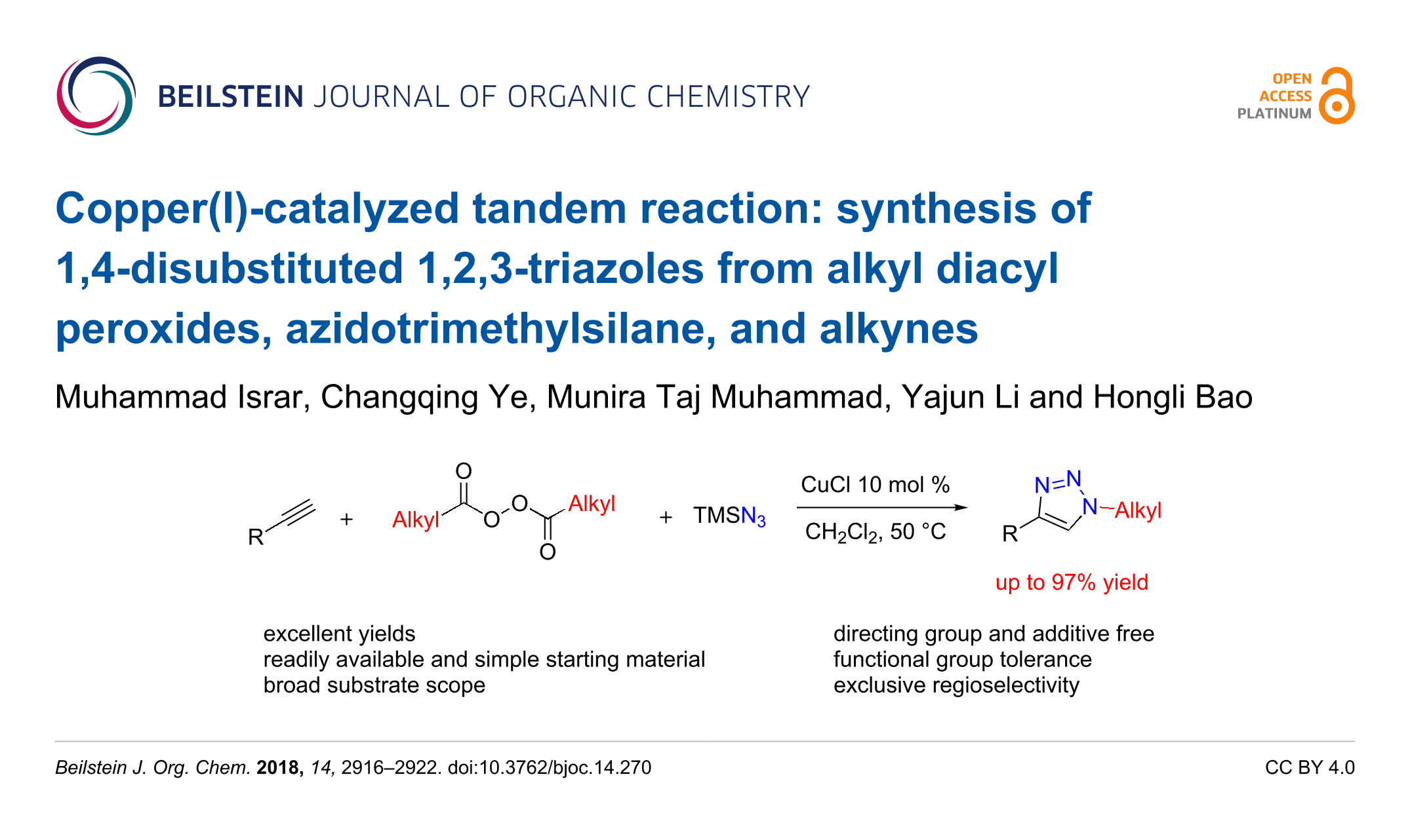 Israr, M.; Ye, C.; Muhammad, M. T.; Li, Y.; Bao, H. Beilstein J. Org. Chem. 2018, 14, 2916–2922. doi:10.3762/bjoc.14.270