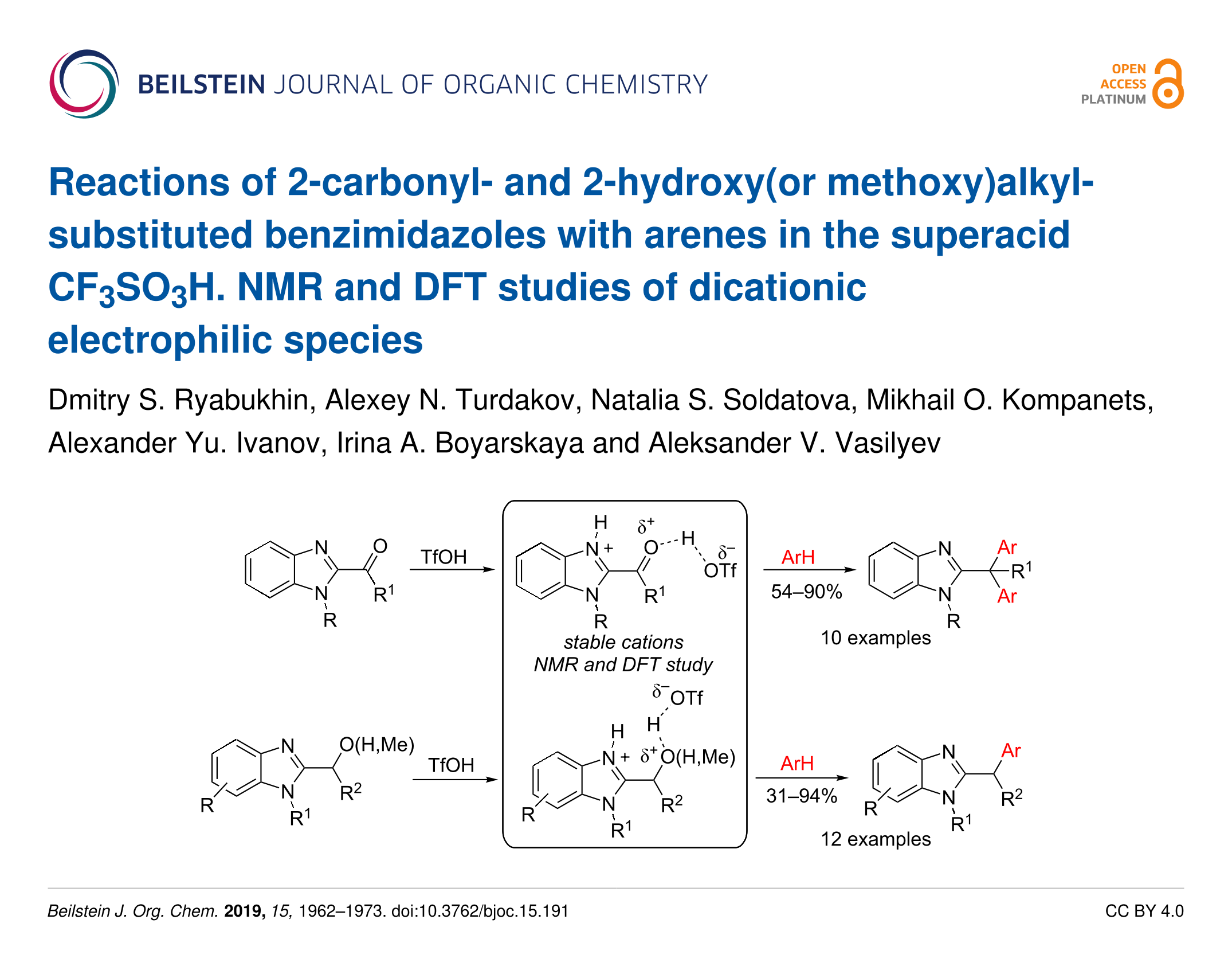 Reactions of 2-carbonyl- and 2-hydroxy(or methoxy)alkyl-substituted benzimidazoles with arenes in the superacid CF3SO3H. NMR and DFT studies of dicationic electrophilic species