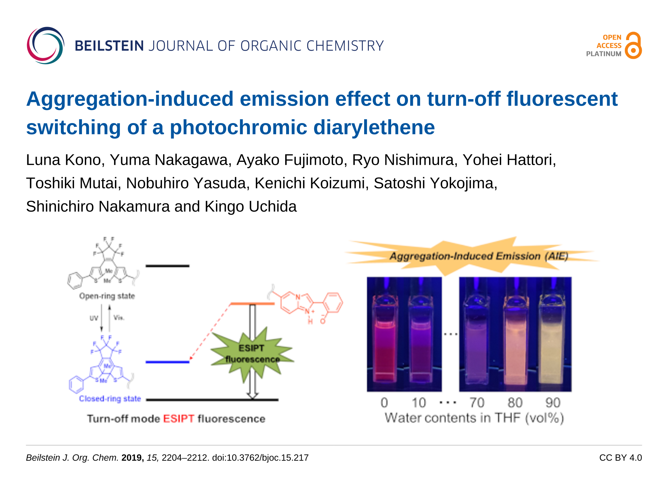 Kono, L.; Nakagawa, Y.; Fujimoto, A.; Nishimura, R.; Hattori, Y.; Mutai, T.; Yasuda, N.; Koizumi, K.; Yokojima, S.; Nakamura, S.; Uchida, K. Beilstein J. Org. Chem. 2019, 15, 2204–2212. doi:10.3762/bjoc.15.217
