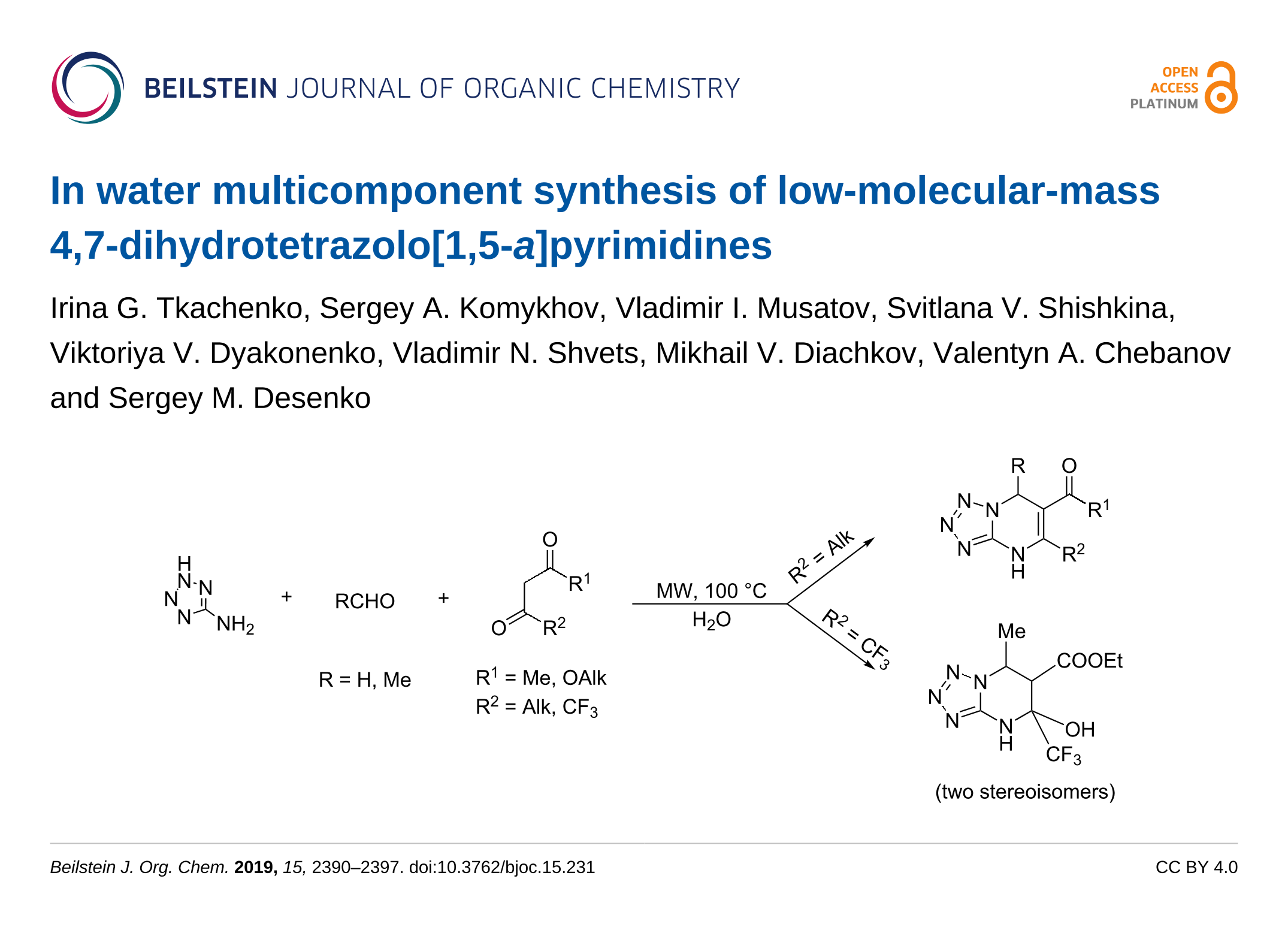 Tkachenko, I. G.; Komykhov, S. A.; Musatov, V. I.; Shishkina, S. V.; Dyakonenko, V. V.; Shvets, V. N.; Diachkov, M. V.; Chebanov, V. A.; Desenko, S. M. Beilstein J. Org. Chem. 2019, 15, 2390–2397. doi:10.3762/bjoc.15.231