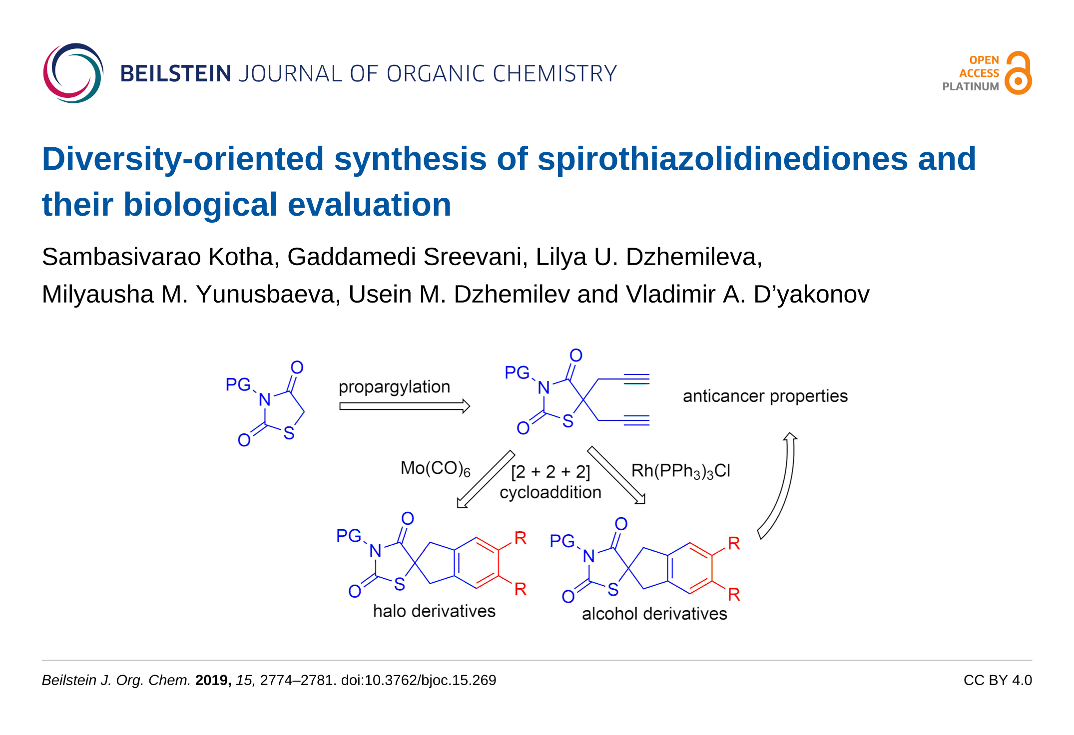 Kotha, S.; Sreevani, G.; Dzhemileva, L. U.; Yunusbaeva, M. M.; Dzhemilev, U. M.; D’yakonov, V. A. Beilstein J. Org. Chem. 2019, 15, 2774–2781. doi:10.3762/bjoc.15.269