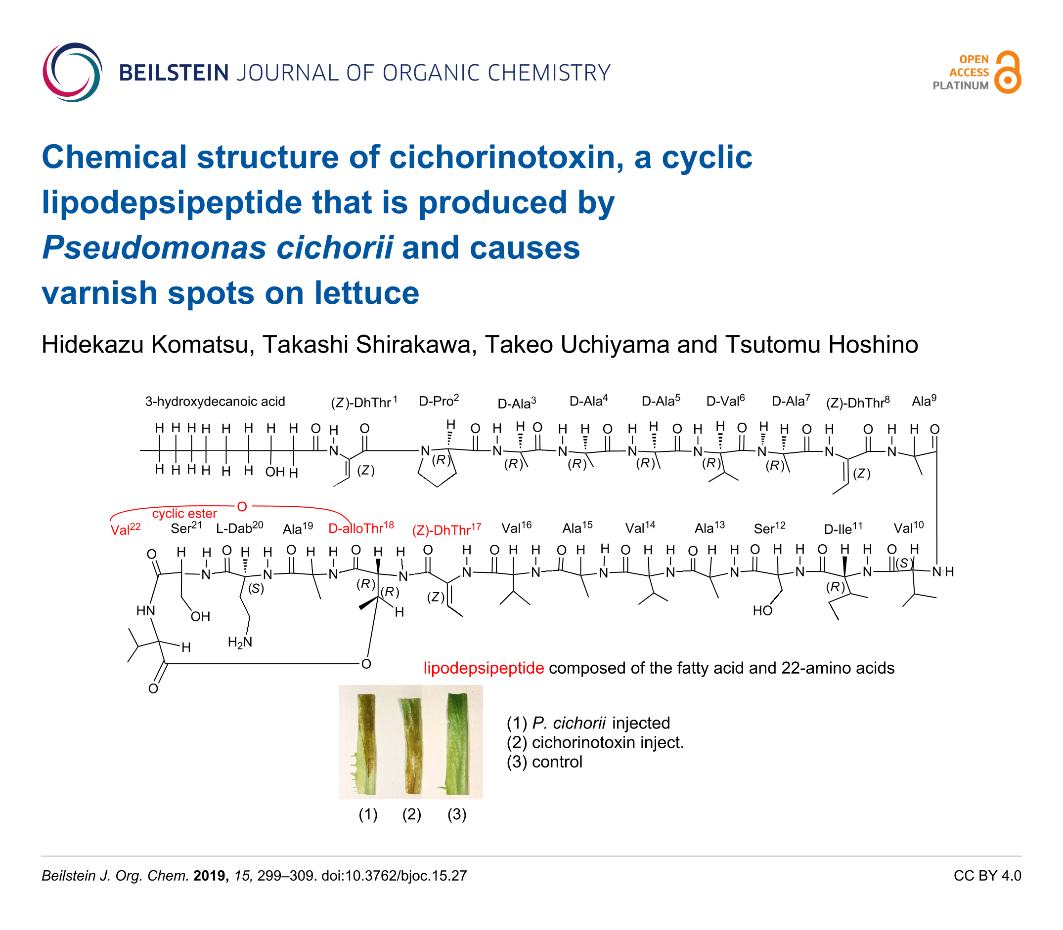 Chemical structure of cichorinotoxin, a cyclic lipodepsipeptide that is produced by Pseudomonas cichorii and causes varnish spots on lettuce