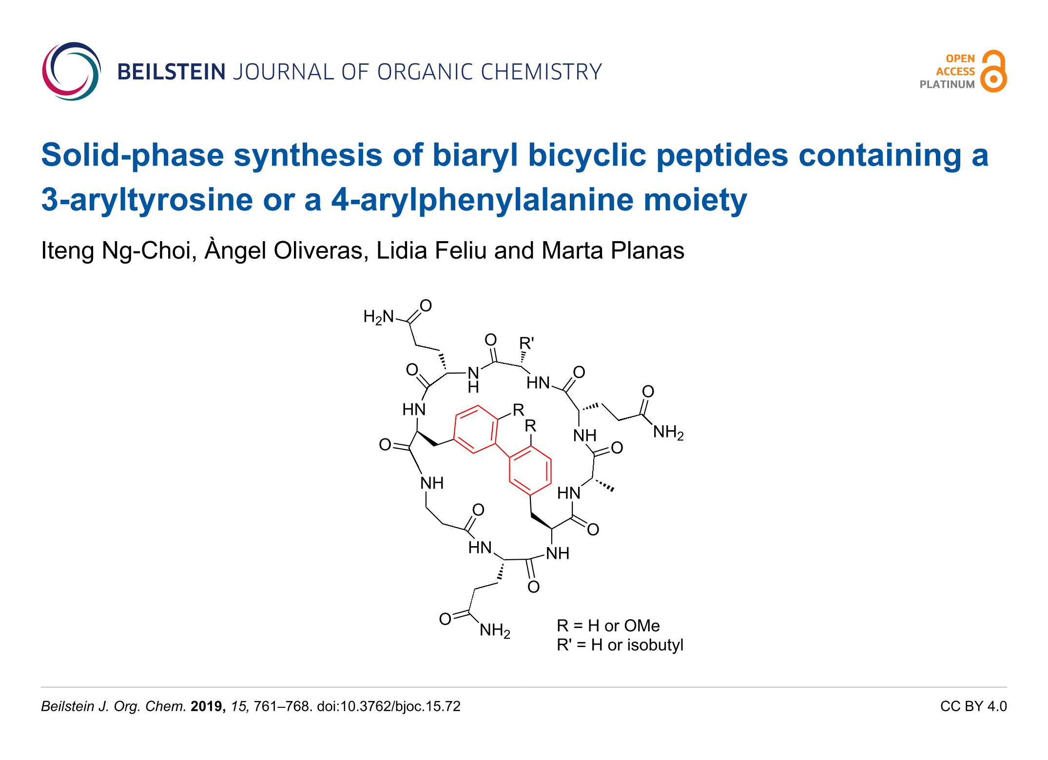 - Ng-Choi, I.; Oliveras, À.; Feliu, L.; Planas, M. Solid-Phase Synthesis of Biaryl Cyclic Peptides Containing a Histidine-Phenylalanine Linkage. International Journal of Peptide Research and Therapeutics 2019, 26, 695–707. doi:10.1007/s10989-019-09877-5