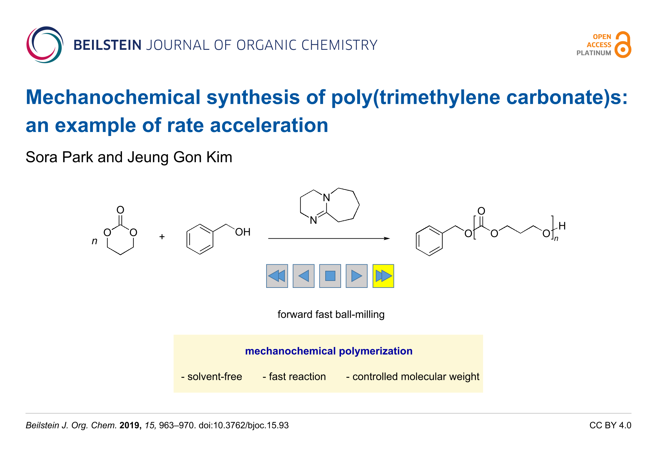 - Chen, K.; Li, S.; Wang, Z.; Lin, Z.; Han, Z.; Wang, X.; Wang, Z.; Hadjichristidis, N. Controlled Solid-State Ring-Opening Polymerization of Cyclic Carbonates via Mechanochemical H-Bonding Organocatalysis. Journal of the American Chemical Society 2025, 147, 26844–26853. doi:10.1021/jacs.5c08373