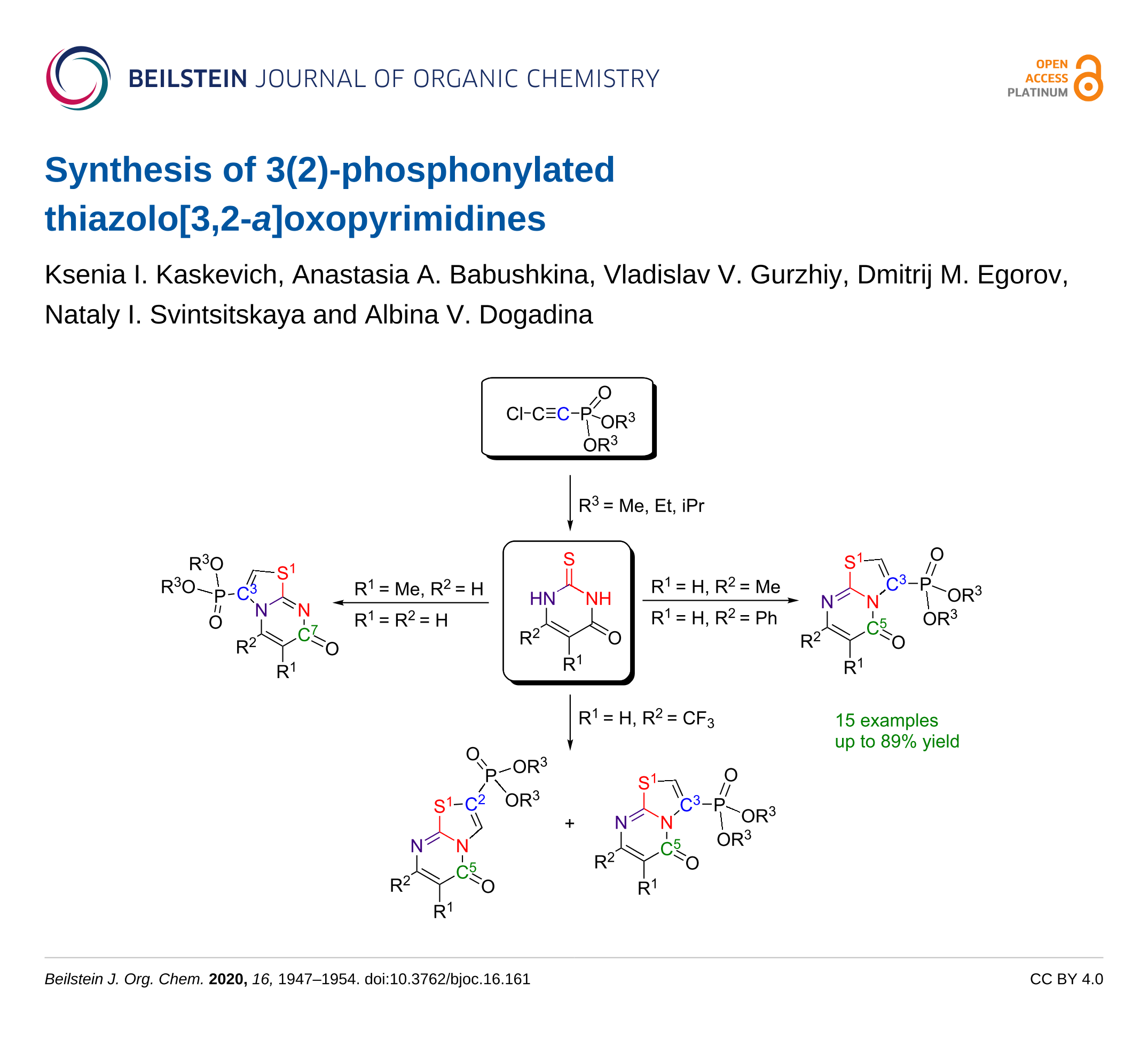 - Babushkina, A. A.; Dogadina, A. V.; Egorov, D. M.; Piterskaia, J. L.; Shtro, A. A.; Nikolaeva, Y. V.; Galochkina, A. V.; Kornev, A. A.; Boitsov, V. M. Efficient synthesis and evaluation of antiviral and antitumor activity of novel 3-phosphonylated thiazolo[3,2-a]oxopyrimidines. Medicinal Chemistry Research 2021, 30, 2203–2215. doi:10.1007/s00044-021-02801-x