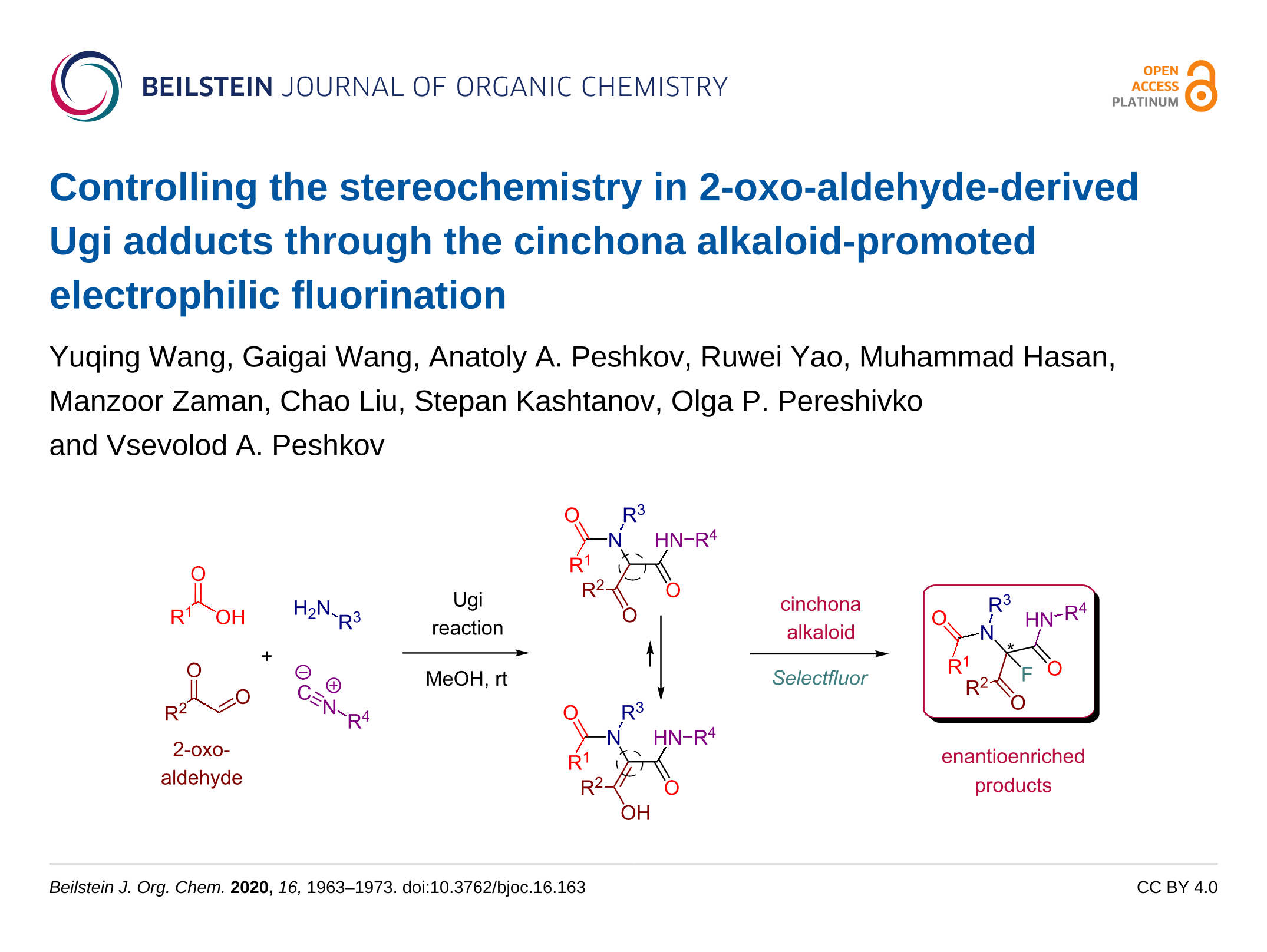 Wang, Y.; Wang, G.; Peshkov, A. A.; Yao, R.; Hasan, M.; Zaman, M.; Liu, C.; Kashtanov, S.; Pereshivko, O. P.; Peshkov, V. A. Beilstein J. Org. Chem. 2020, 16, 1963–1973. doi:10.3762/bjoc.16.163