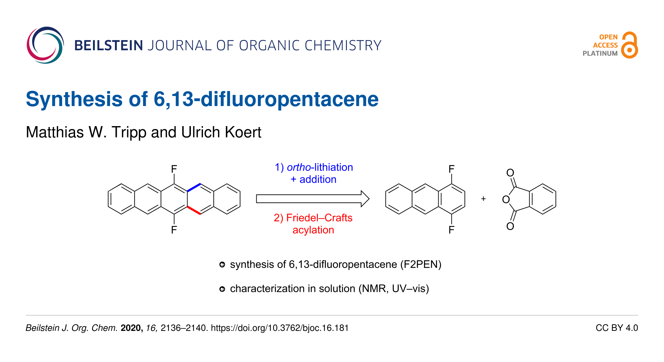 - Pessi Kenmogne, R. E.; Xie, X.; Koert, U. Bidirectional Synthesis of C2-Symmetric Unilateral Substituted Acenes: 1,10,11,12-Tetrafluorotetracene. Organic letters 2025, 27, 11935–11939. doi:10.1021/acs.orglett.5c03896