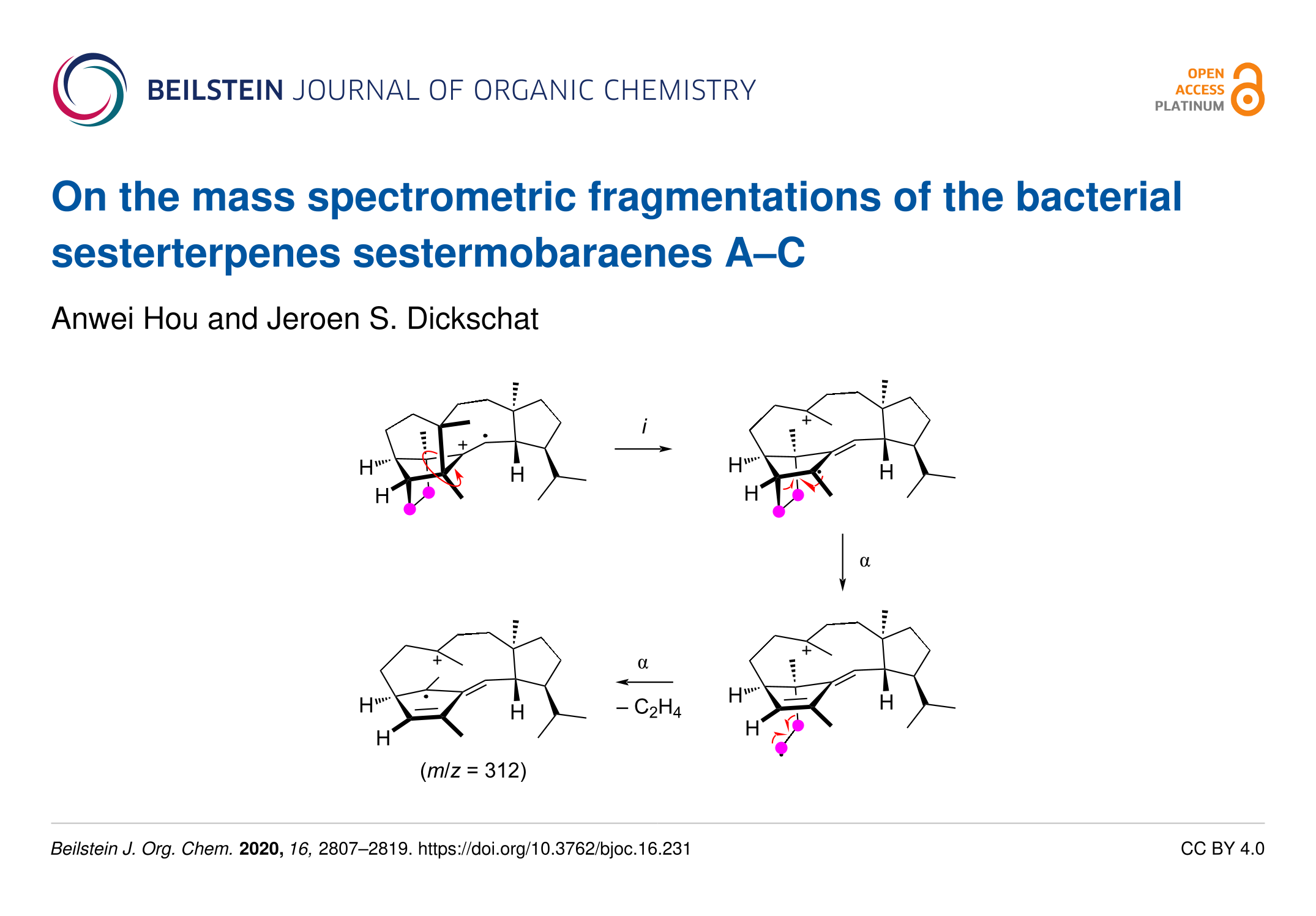 - Hou, A.; Dickschat, J. S. The EI-MS Fragmentation Mechanisms of the Bacterial Diterpenes Polytrichastrene A and Wanju-2,5-diene. European Journal of Organic Chemistry 2021, 2021, 6417–6423. doi:10.1002/ejoc.202101151