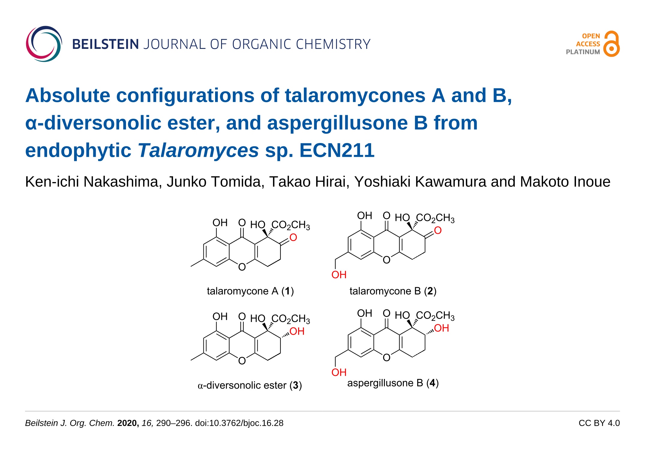Absolute configurations of talaromycones A and B, α-diversonolic ester, and aspergillusone B from endophytic Talaromyces sp. ECN211