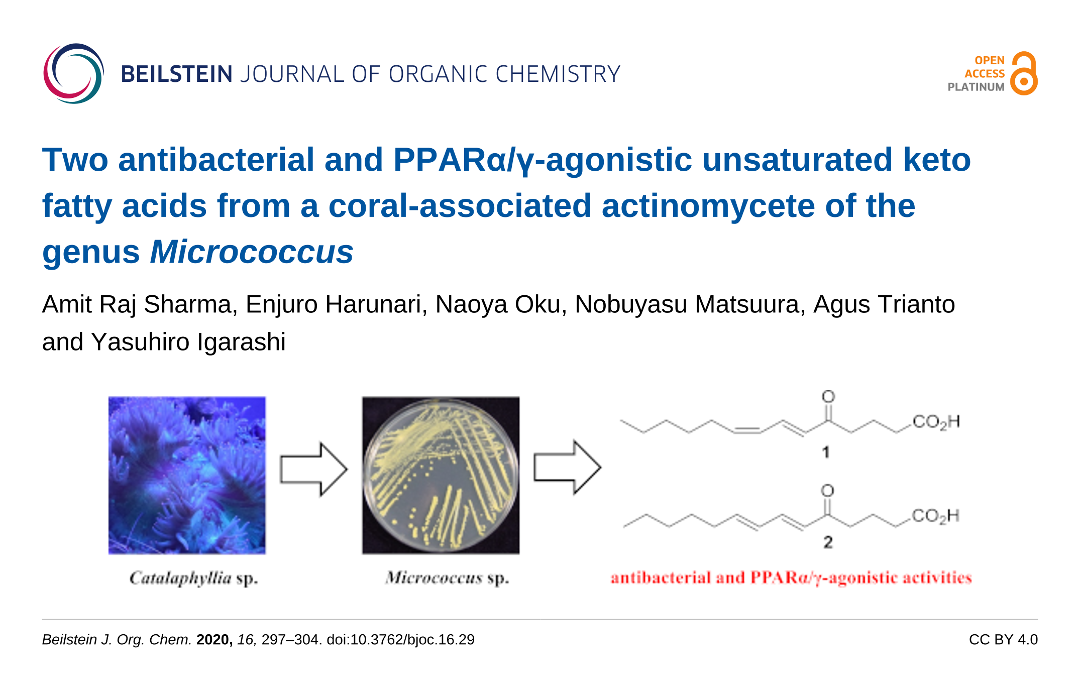 Sharma, A. R.; Harunari, E.; Oku, N.; Matsuura, N.; Trianto, A.; Igarashi, Y. Beilstein J. Org. Chem. 2020, 16, 297–304. doi:10.3762/bjoc.16.29