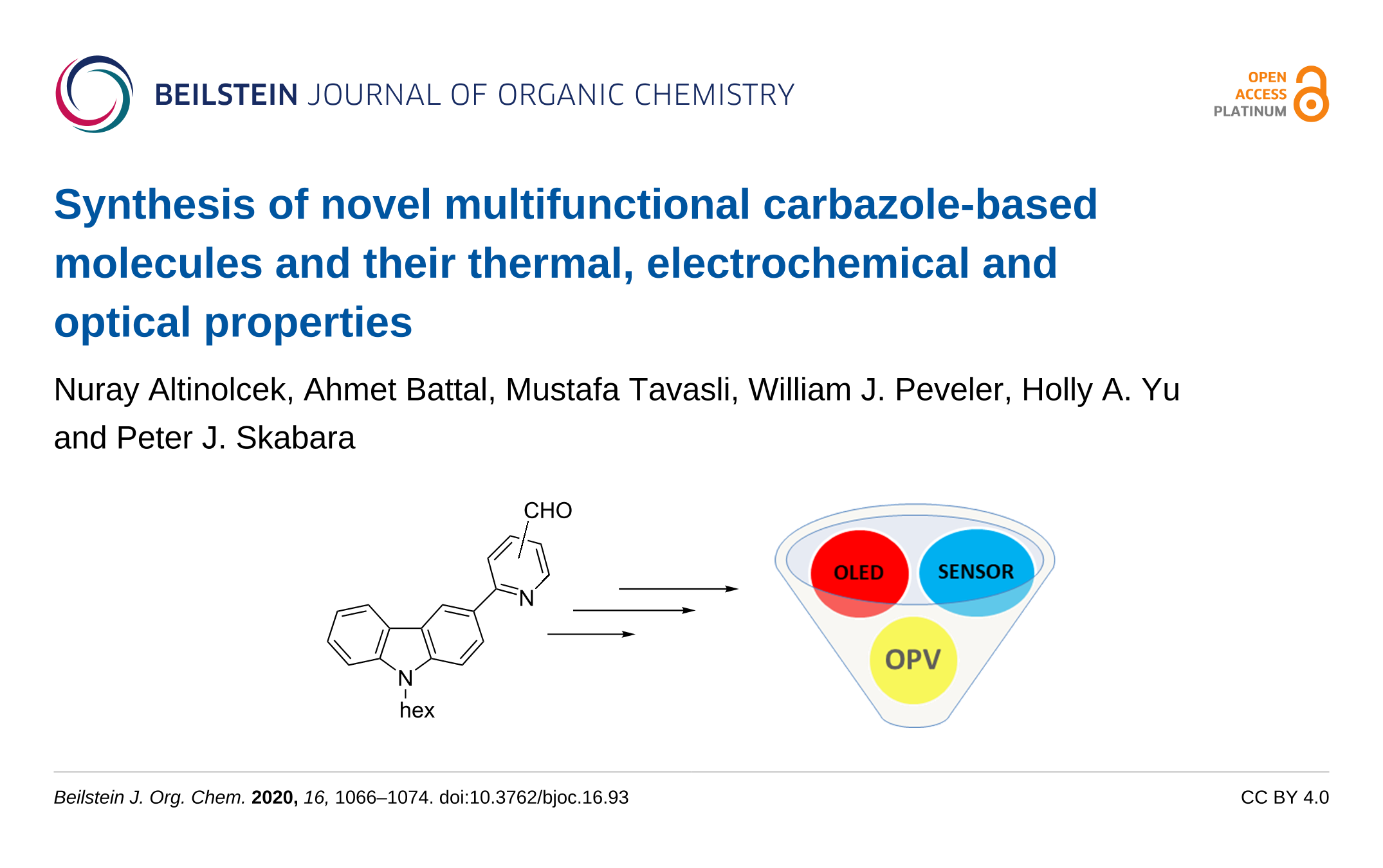 Altinolcek, N.; Battal, A.; Tavasli, M.; Peveler, W. J.; Yu, H. A.; Skabara, P. J. Beilstein J. Org. Chem. 2020, 16, 1066–1074. doi:10.3762/bjoc.16.93