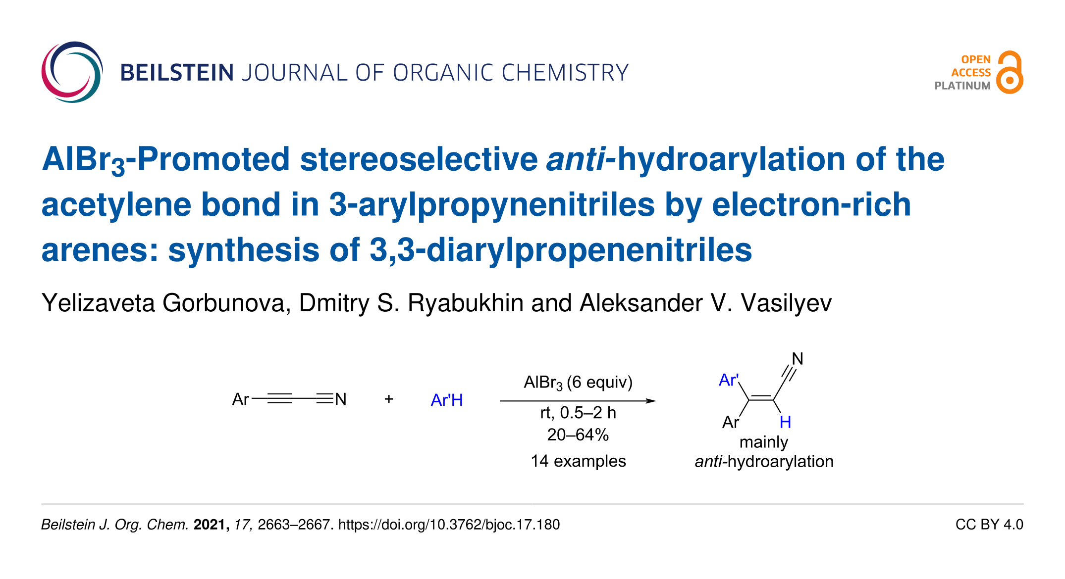 AlBr3-Promoted stereoselective anti-hydroarylation of the acetylene bond in 3-arylpropynenitriles by electron-rich arenes: synthesis of 3,3-diarylpropenenitriles