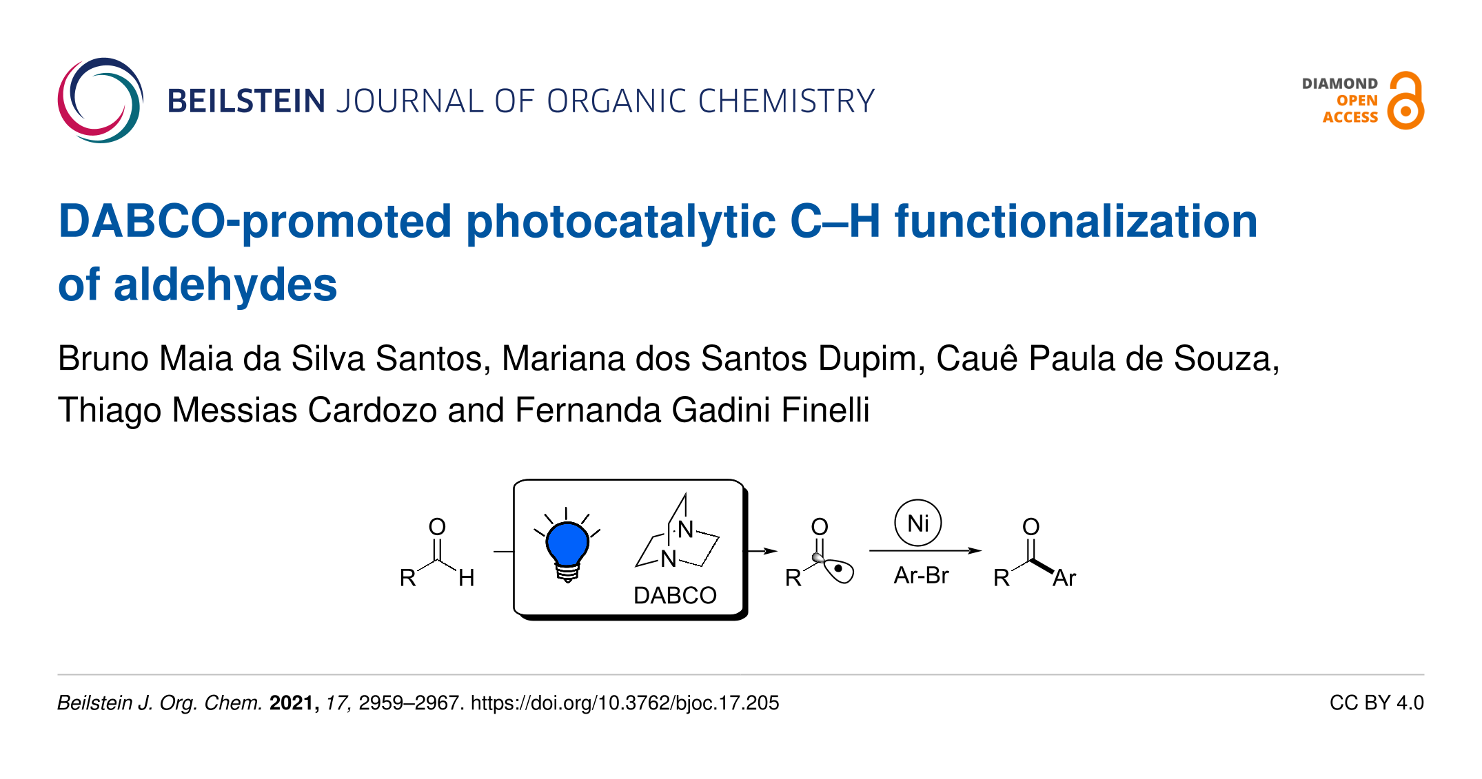 Maia da Silva Santos, B.; dos Santos Dupim, M.; Paula de Souza, C.; Messias Cardozo, T.; Gadini Finelli, F. Beilstein J. Org. Chem. 2021, 17, 2959–2967. doi:10.3762/bjoc.17.205