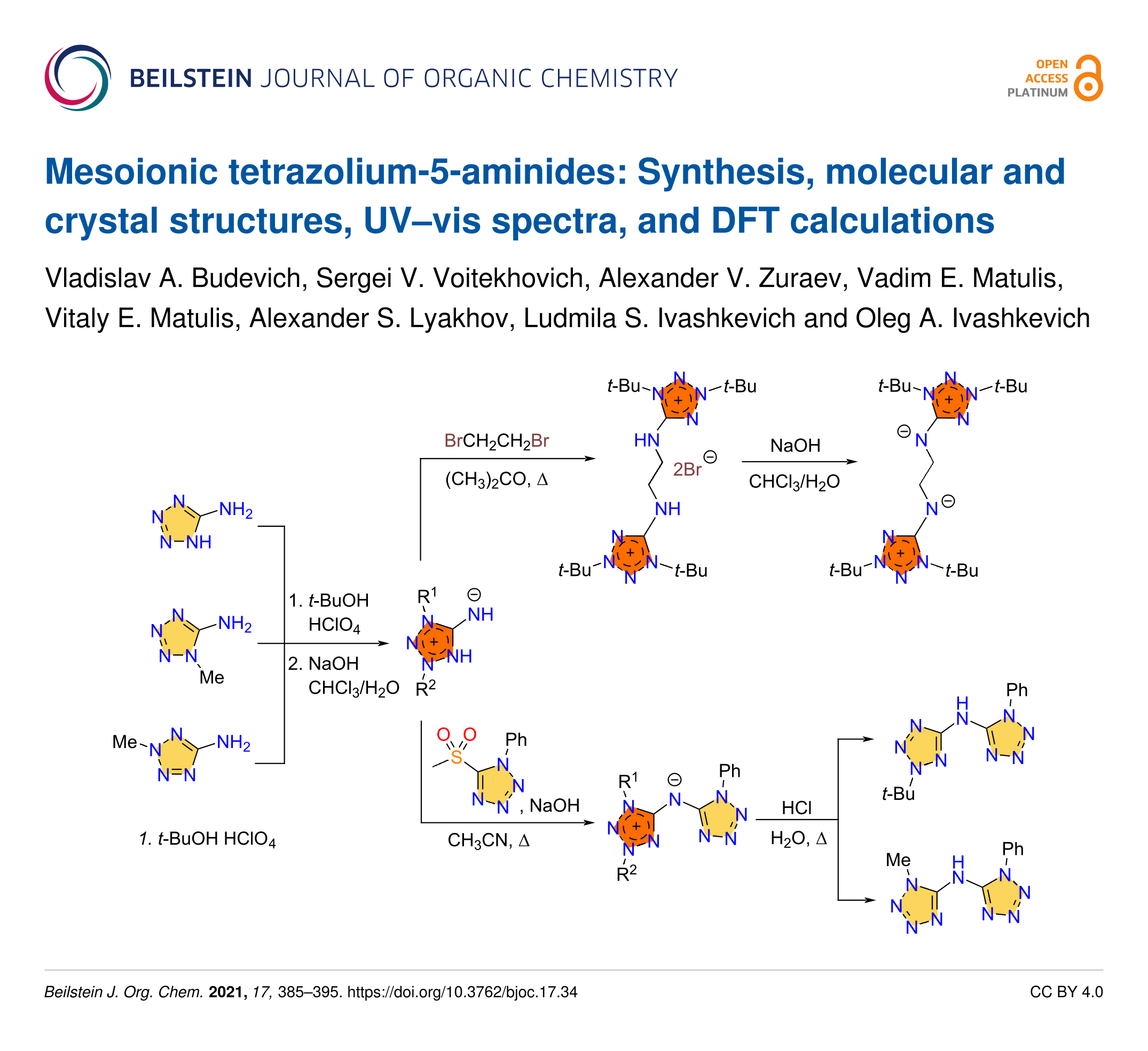 - Budevich, V. A.; Ivashkevich, L. S.; Zuraev, A. V.; Voitekhovich, S. V.; Ivashkevich, O. A. Copper-assisted dealkylation of mesoionic N-benzoyl-1,3-di-tert-butyltetrazolium-5-aminide. Inorganic Chemistry Communications 2025, 180, 115039. doi:10.1016/j.inoche.2025.115039