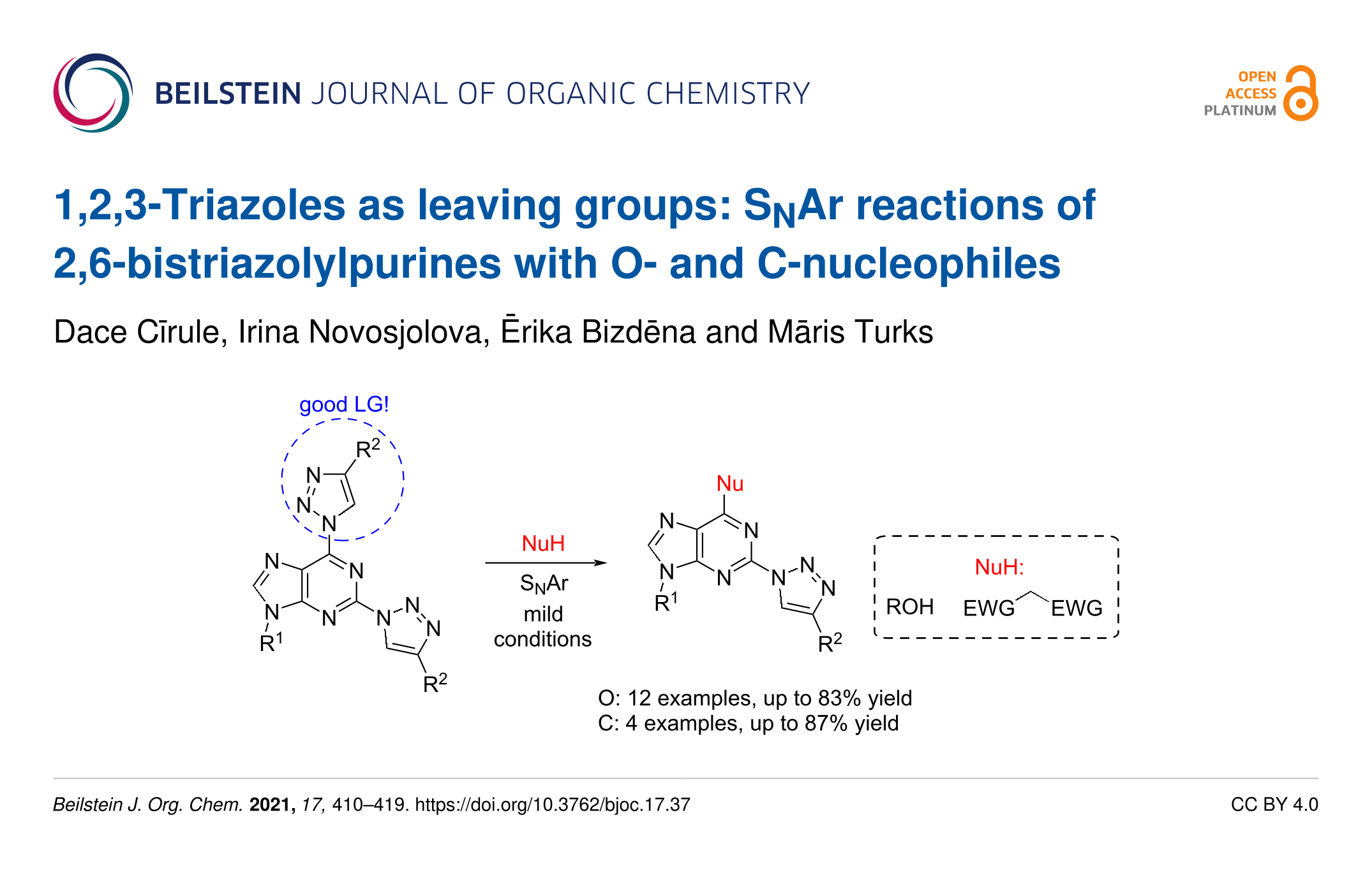 - Cīrule, D.; Novosjolova, I.; Bizdēna, Ē.; Turks, M. 1,2,3-Triazoles as leaving groups: SNAr reactions of 2,6-bistriazolylpurines with O- and C-nucleophiles. Beilstein journal of organic chemistry 2021, 17, 410–419. doi:10.3762/bjoc.17.37