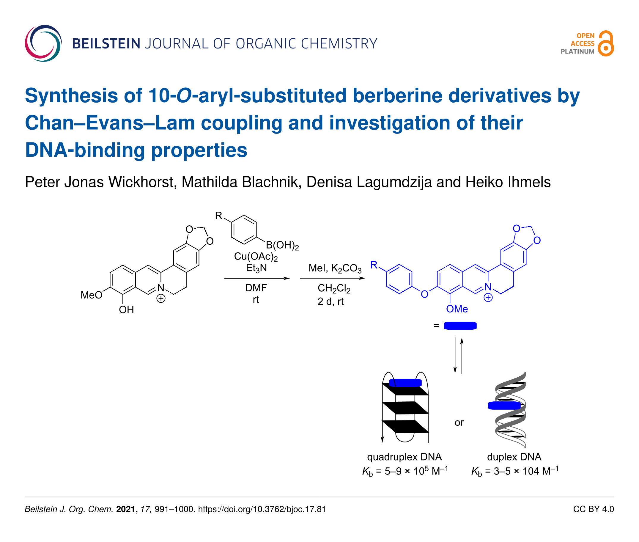 Synthesis of 10-O-aryl-substituted berberine derivatives by Chan–Evans–Lam coupling and investigation of their DNA-binding properties