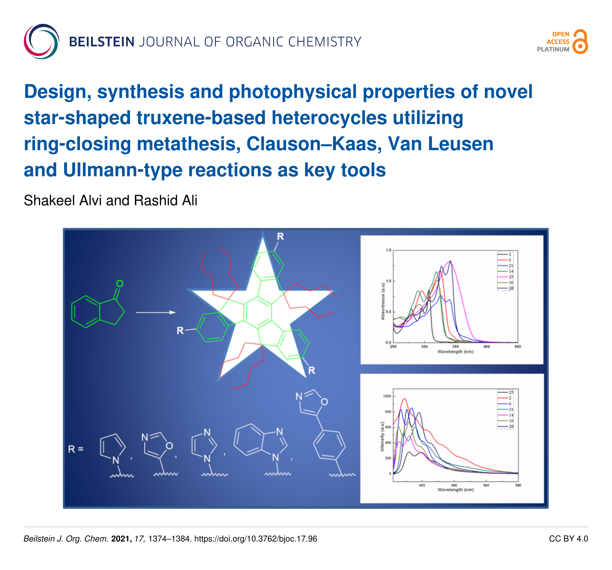 - Alvi, S.; Sil, A.; Maity, S.; Singh, V.; Guchhait, B.; Ali, R. C3-Symmetric Indole-Based Truxenes: Design, Synthesis, and Photophysical Studies. ACS omega 2024, 9, 9098–9108. doi:10.1021/acsomega.3c07770