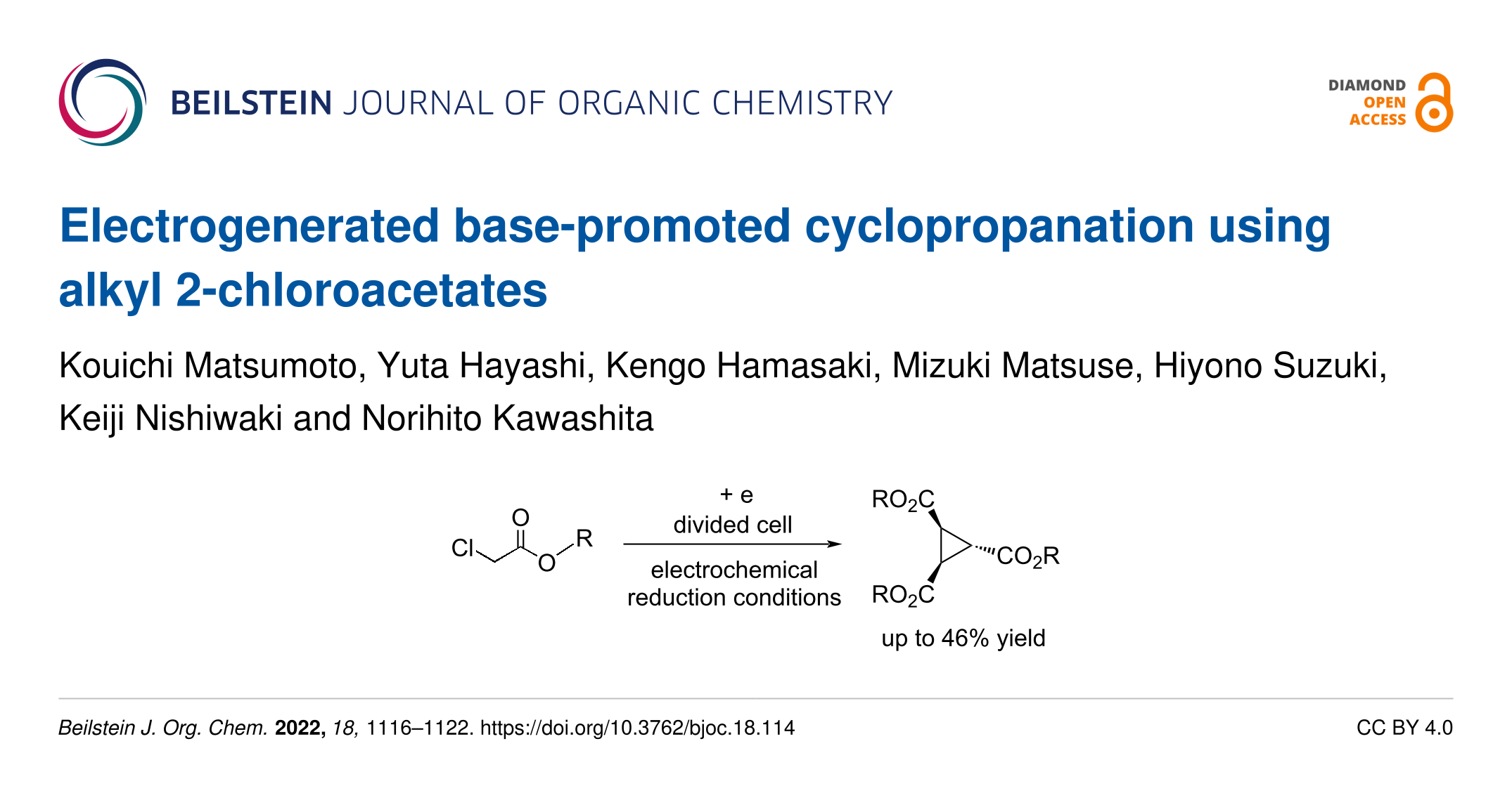 - Matsumoto, K.; Matsuse, M.; Hamasaki, K.; Suzuki, H.; Okubo, S.; Togo, A.; Okayama, Y.; Kawashita, N. Electro-generated base from amide derivative enables cyclopropanation of alkyl 2-chloroacetate without formation of trialkyl propane-1,2,3-carboxylate. Chemistry Letters 2023, 53. doi:10.1093/chemle/upad035
