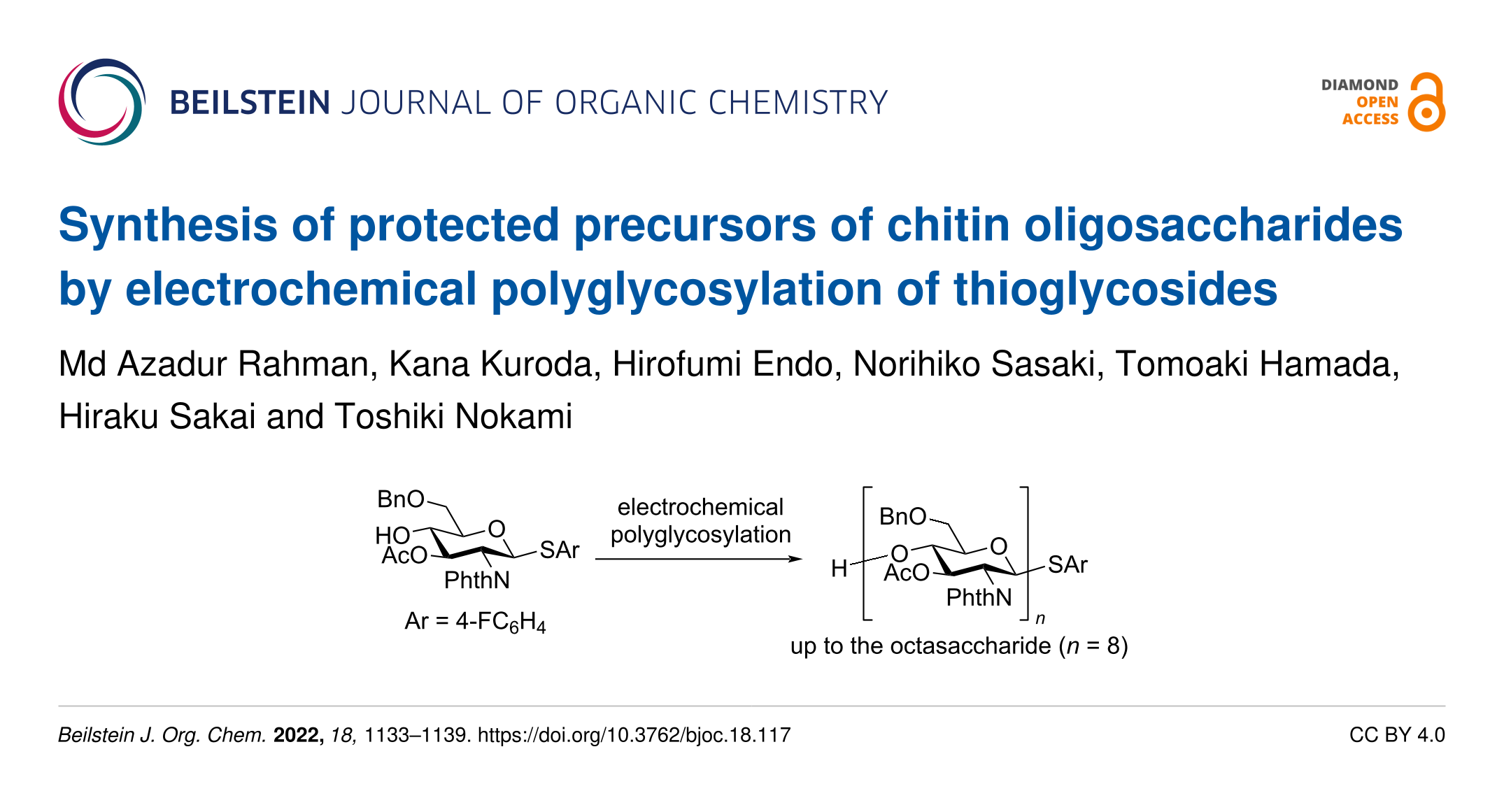 - Rahman, M. A.; Endo, H.; Yamamoto, T.; Okushiba, S.; Sasaki, N.; Nokami, T. Synthesis of cyclic β-1,6-oligosaccharides from glucosamine monomers by electrochemical polyglycosylation. Beilstein journal of organic chemistry 2024, 20, 1421–1427. doi:10.3762/bjoc.20.124