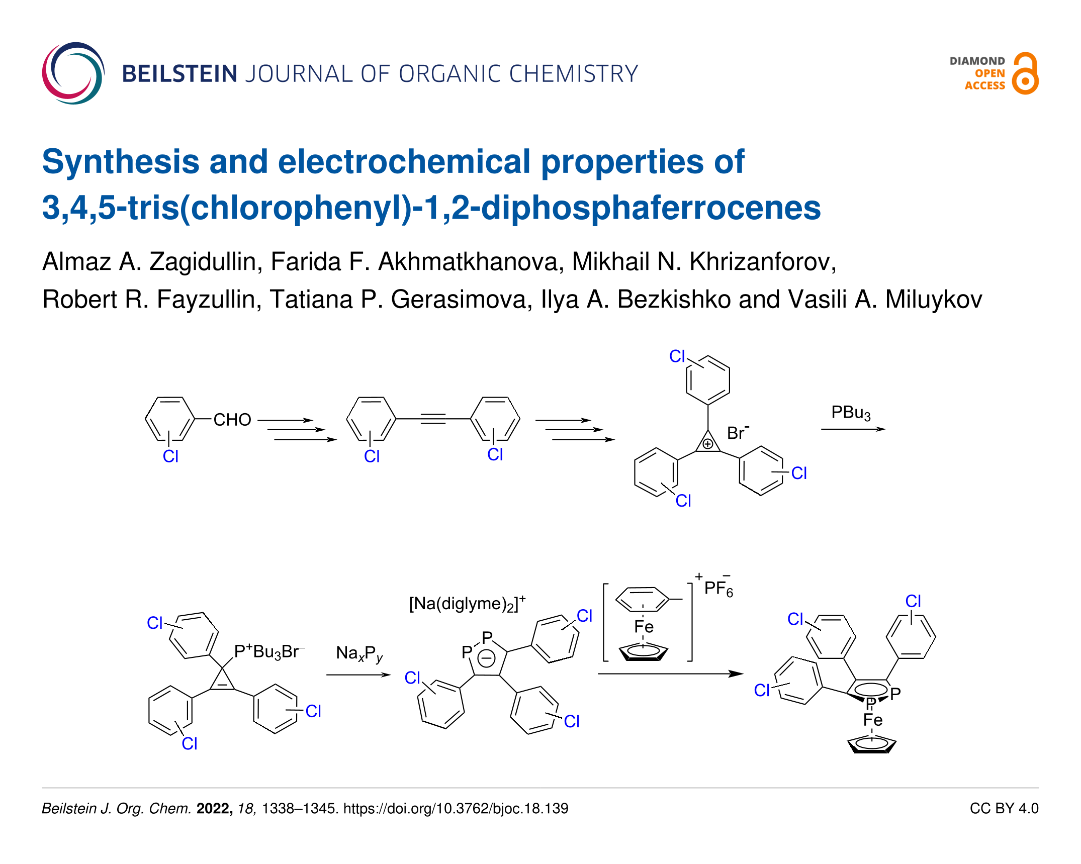 - Bezkishko, I. A.; Zagidullin, A. A.; Fayzullin, R. R.; Samorodnova, A. P.; Khrizanforov, M. N.; Zinnatullin, A. L.; Vagizov, F. G.; Miluykov, V. A. New heteroleptic 3,4,5-tris(p-fluorophenyl)-1,2-diphosphaferrocene: synthesis, electrochemical properties, and Mössbauer spectroscopy. Russian Chemical Bulletin 2024, 73, 2099–2104. doi:10.1007/s11172-024-4329-0